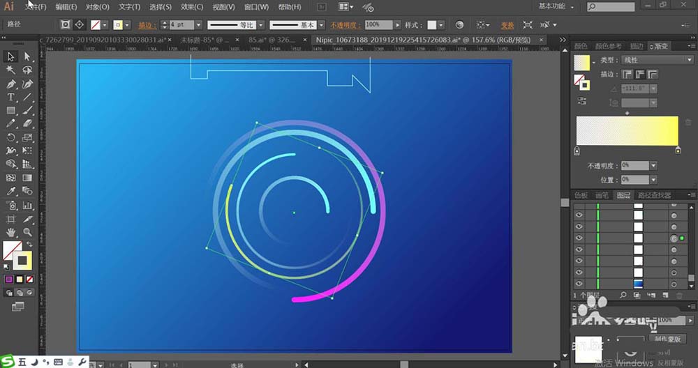 5、這一步,我們?cè)儆镁G色的漸變描邊紅藍(lán)色漸變之間的線條,使用黃色填充線條上面的圓點(diǎn)。