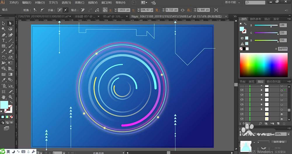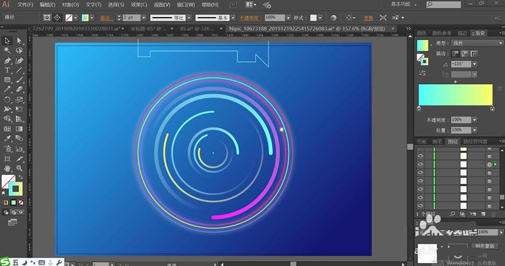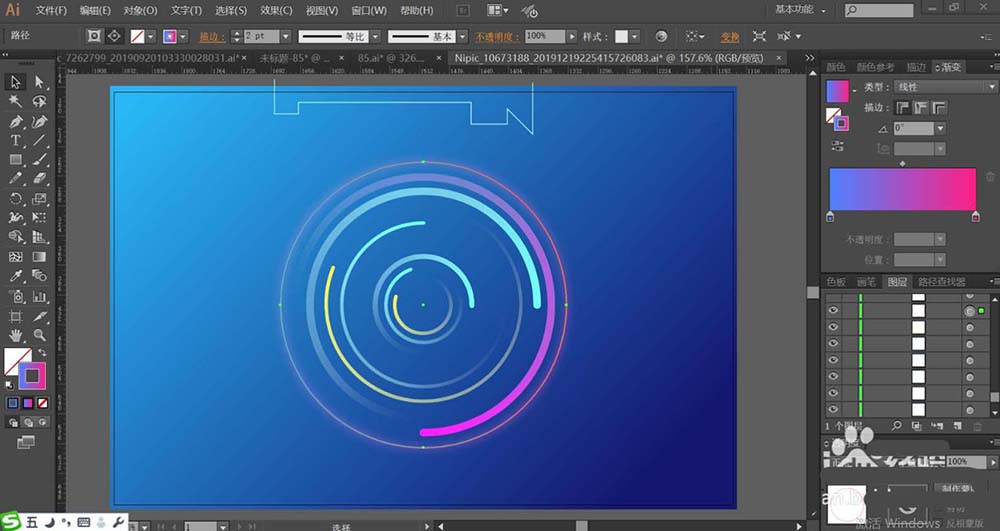 3、使用青色到透明的漸變對(duì)于圓形進(jìn)行描邊,再用粉紅色到透明的漸變對(duì)于大圓形進(jìn)行描邊。