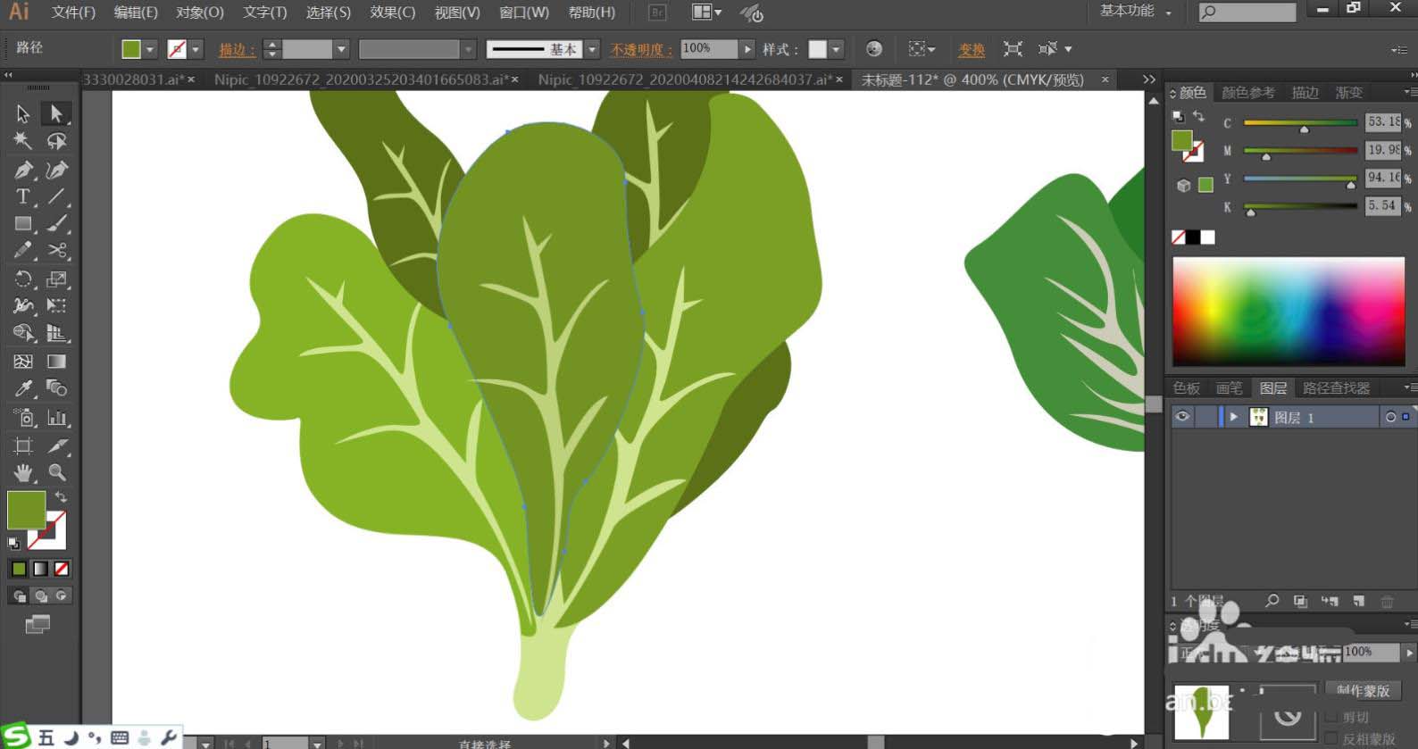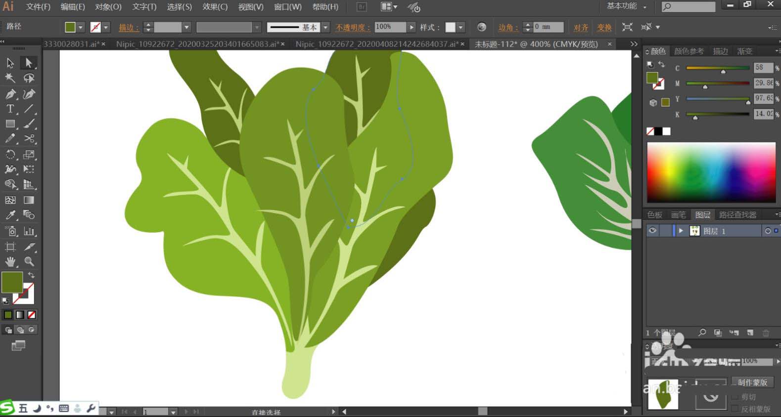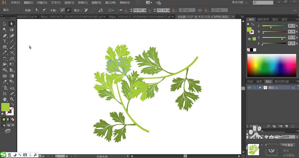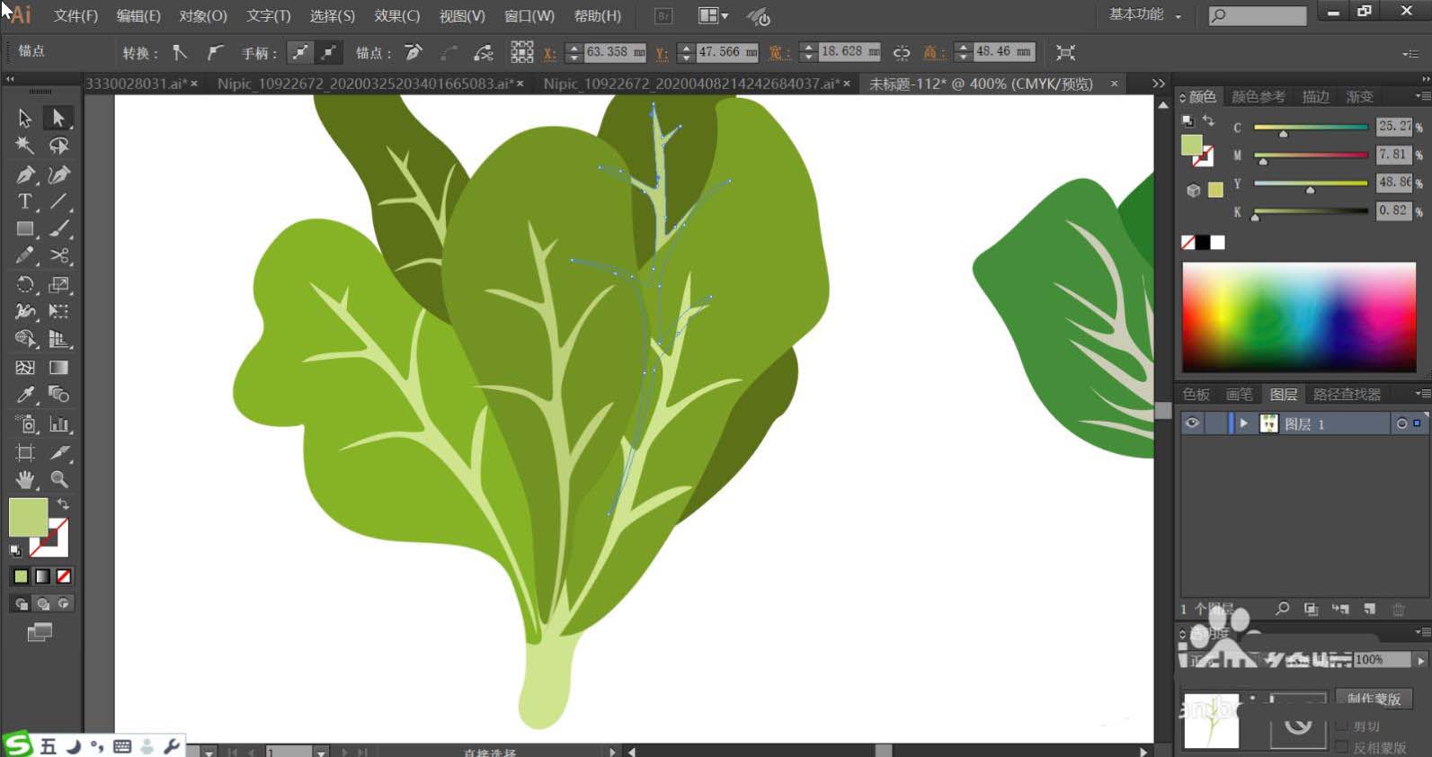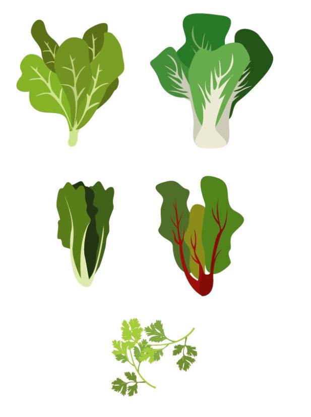 2、使用淺綠色與深綠色填充不同的葉片,再用綠色填充葉片之間的莖桿,讓完整的菜葉呈現(xiàn)出來(lái)。