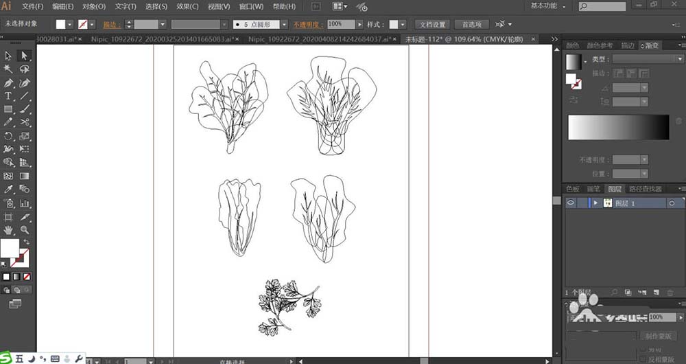 1、使用鋼筆畫出多棵不同蔬菜的形狀細(xì)節(jié),再把色彩的明暗路徑通過(guò)鋼筆繪制在菜葉的上面。每一片的葉子在形狀上都有著不同的變化,再組合成完整的蔬菜。