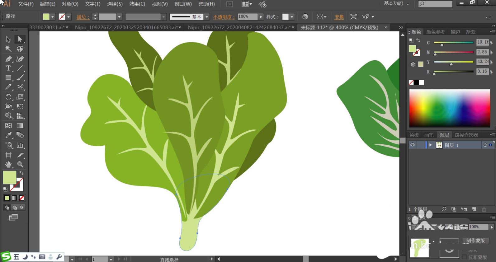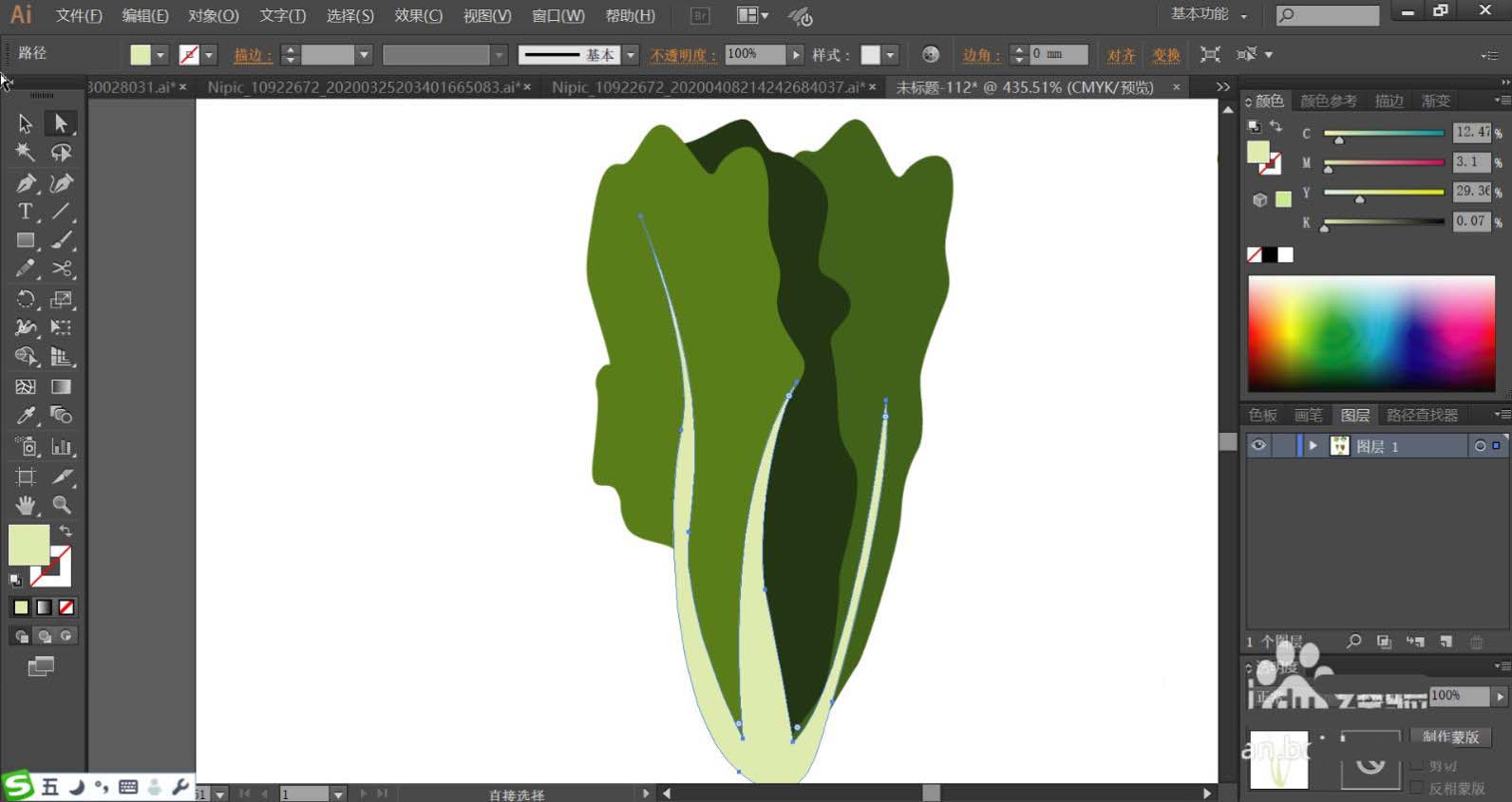 3、使用淺綠灰色填充青菜的根莖的路徑,再用明暗兩種綠色填充左側(cè)與右側(cè)的葉片,葉片中間的陰影使用綠黑色填充。