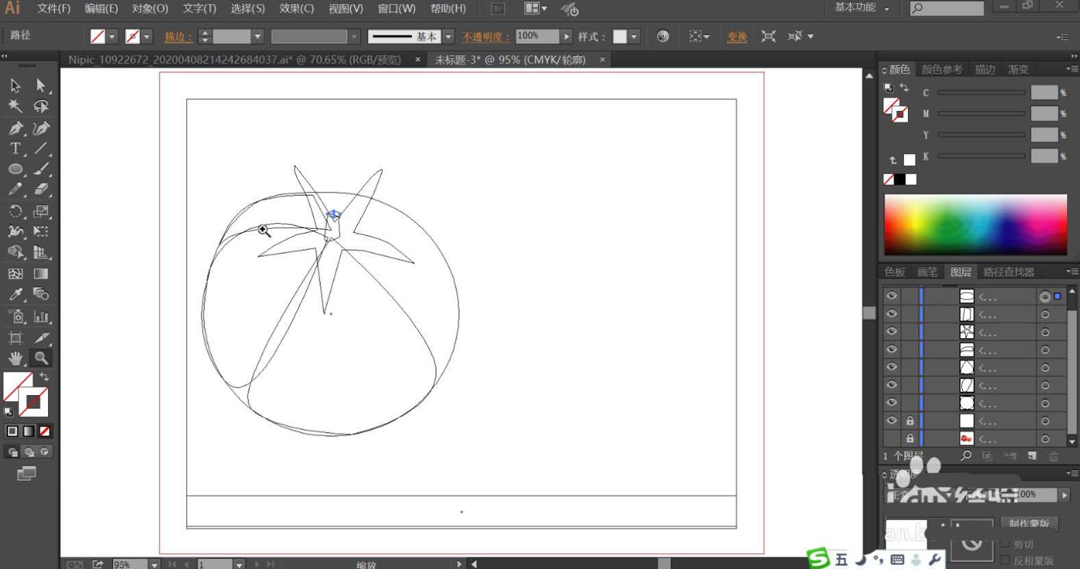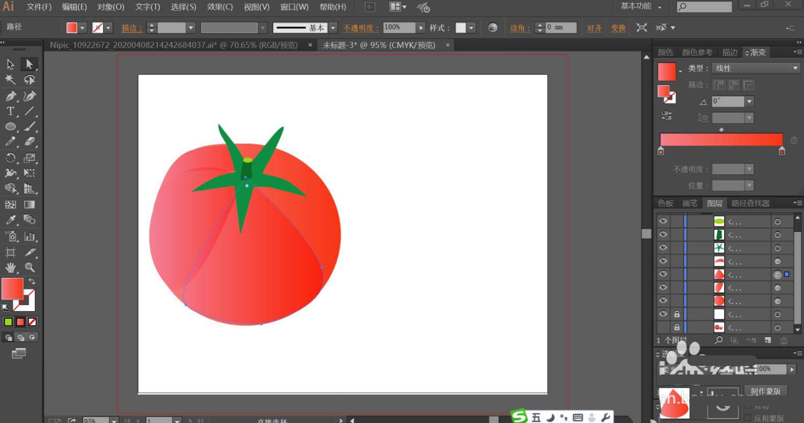 1、使用圓形畫出番茄所在的圓形,再用鋼筆畫出番茄表面的不同色調(diào)的圓弧,再畫出番茄頂端的結(jié)頭細(xì)節(jié)路徑。