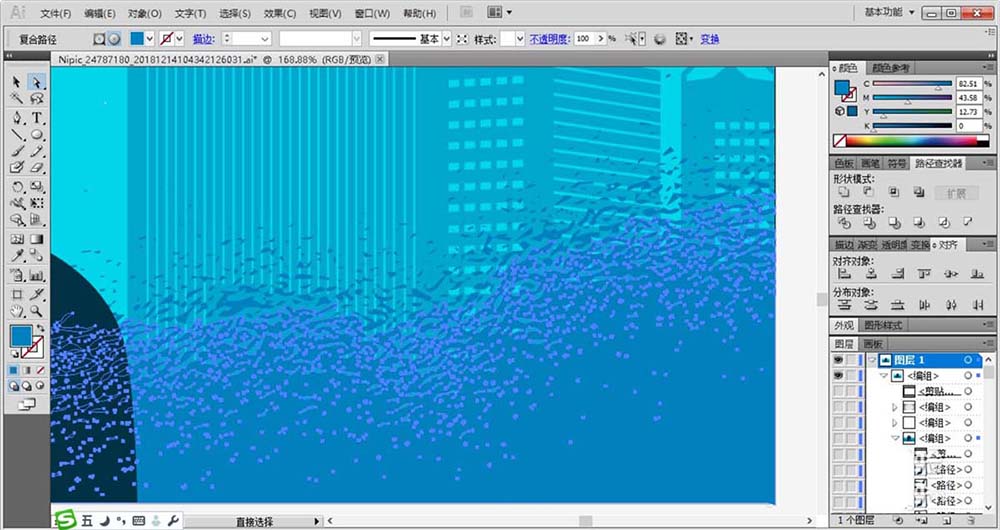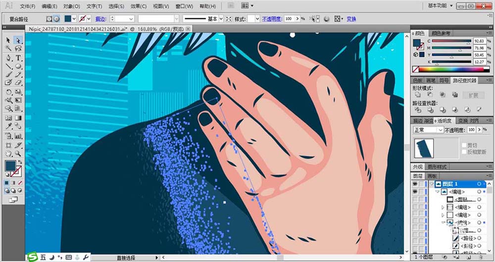 2、樓房下方為暗光區(qū)域,我們使用暗藍(lán)色填充,在暗光與樓房交接的地方使用鋼筆畫出過渡區(qū)域的路徑并填充暗藍(lán)色。