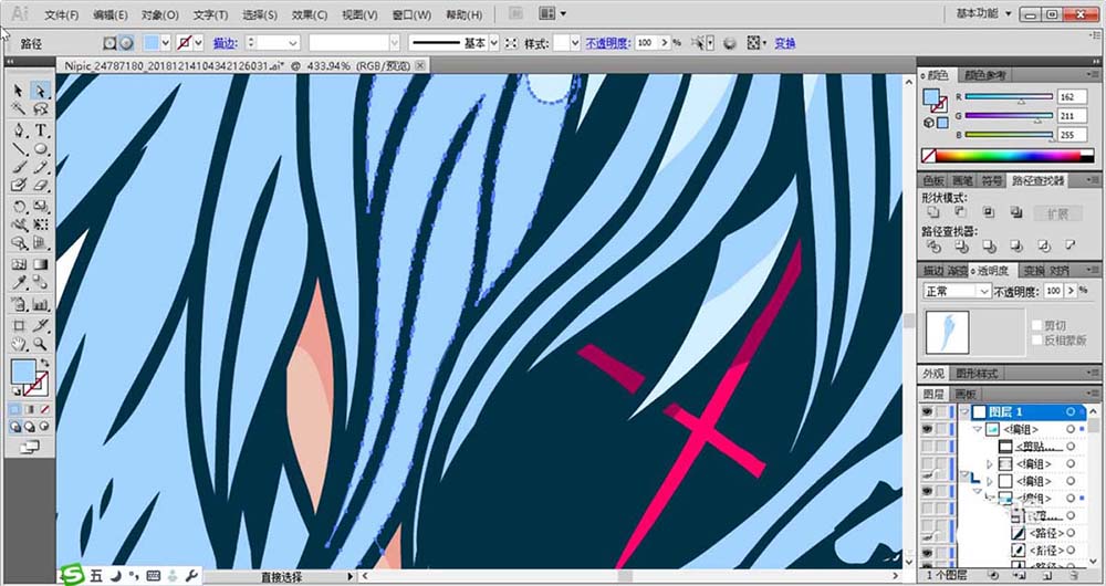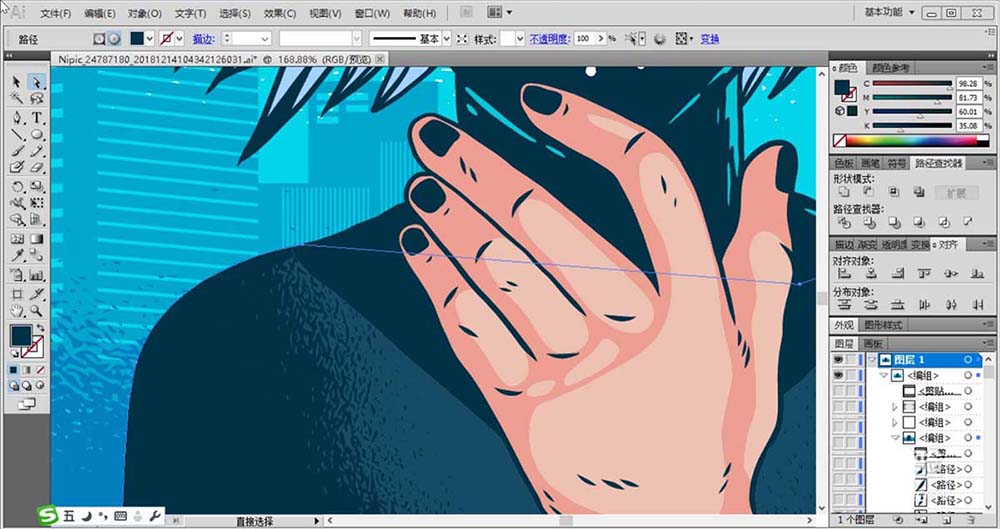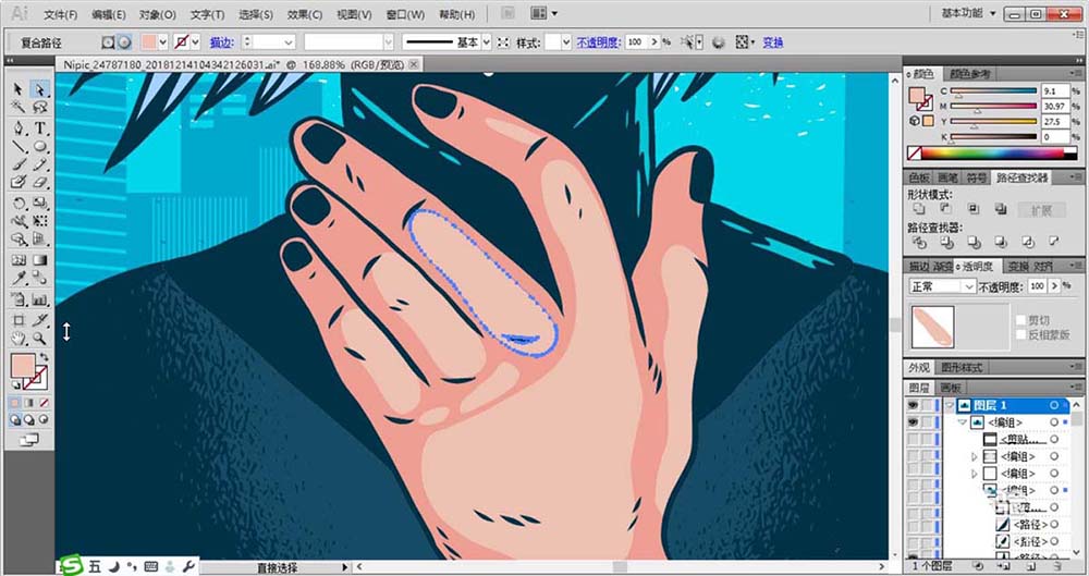 4、男孩的手掌使用粉紅色填充,在亮光路徑上使用淺粉色填充,指甲使用藍(lán)黑色填充,手掌上面的雜色使用藍(lán)黑色填充。