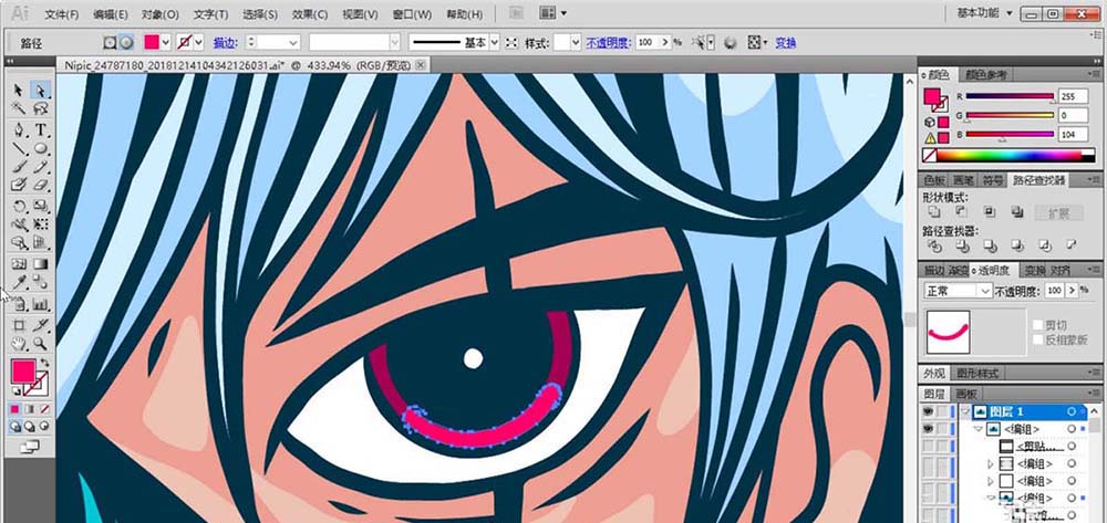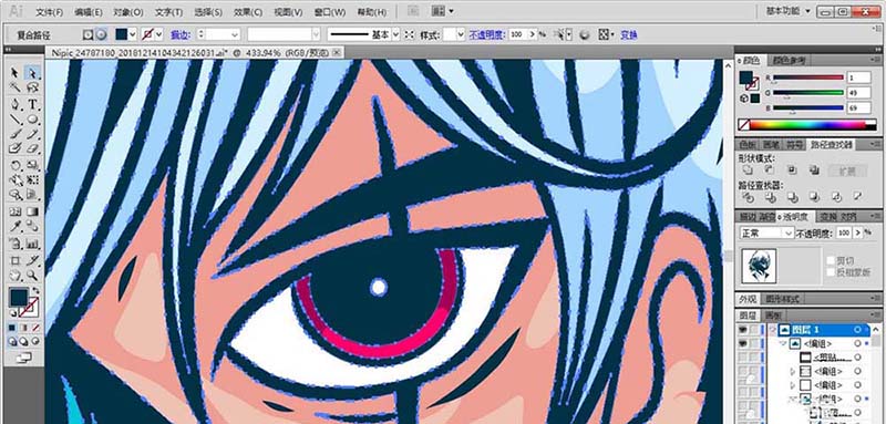 6、男孩的眼晴使用藍(lán)黑色與白色搭配填充眼白與瞳孔,再用明暗品紅色勾勒瞳孔的外邊緣,瞳孔的高光點(diǎn)使用白色填充。眉毛使用藍(lán)黑色填充,再用藍(lán)黑色勾勒出眼晴外面的光線變化路徑。