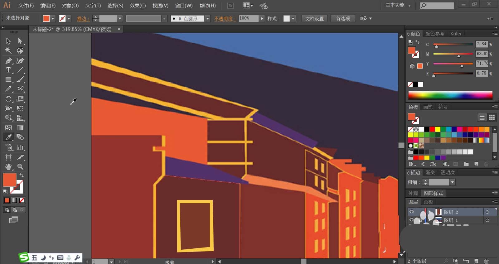 2、使用紅棕色填充墻壁與窗戶,再用黃色填充窗戶的邊框,墻壁在最底層,窗戶玻璃在最上面一層。