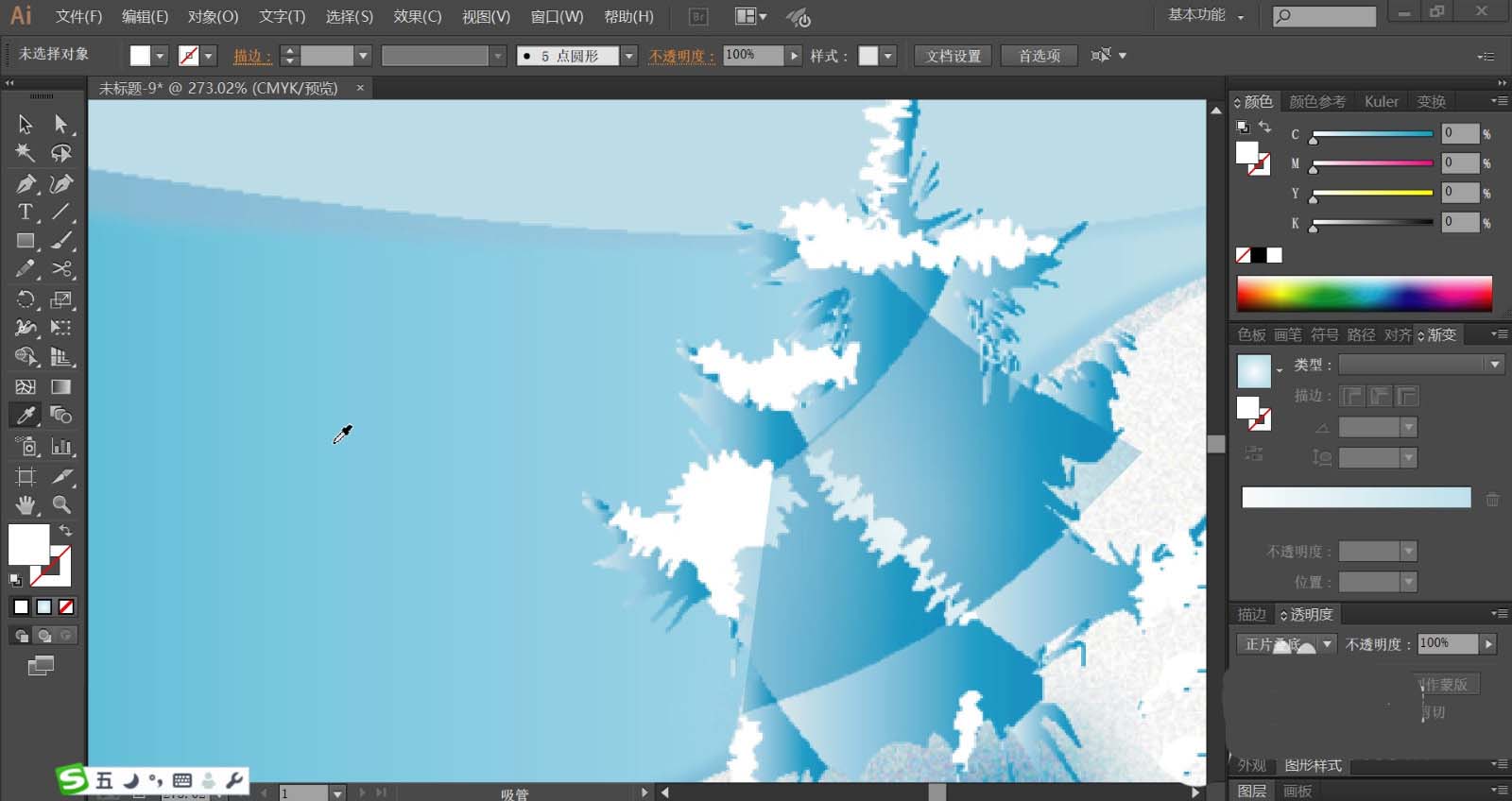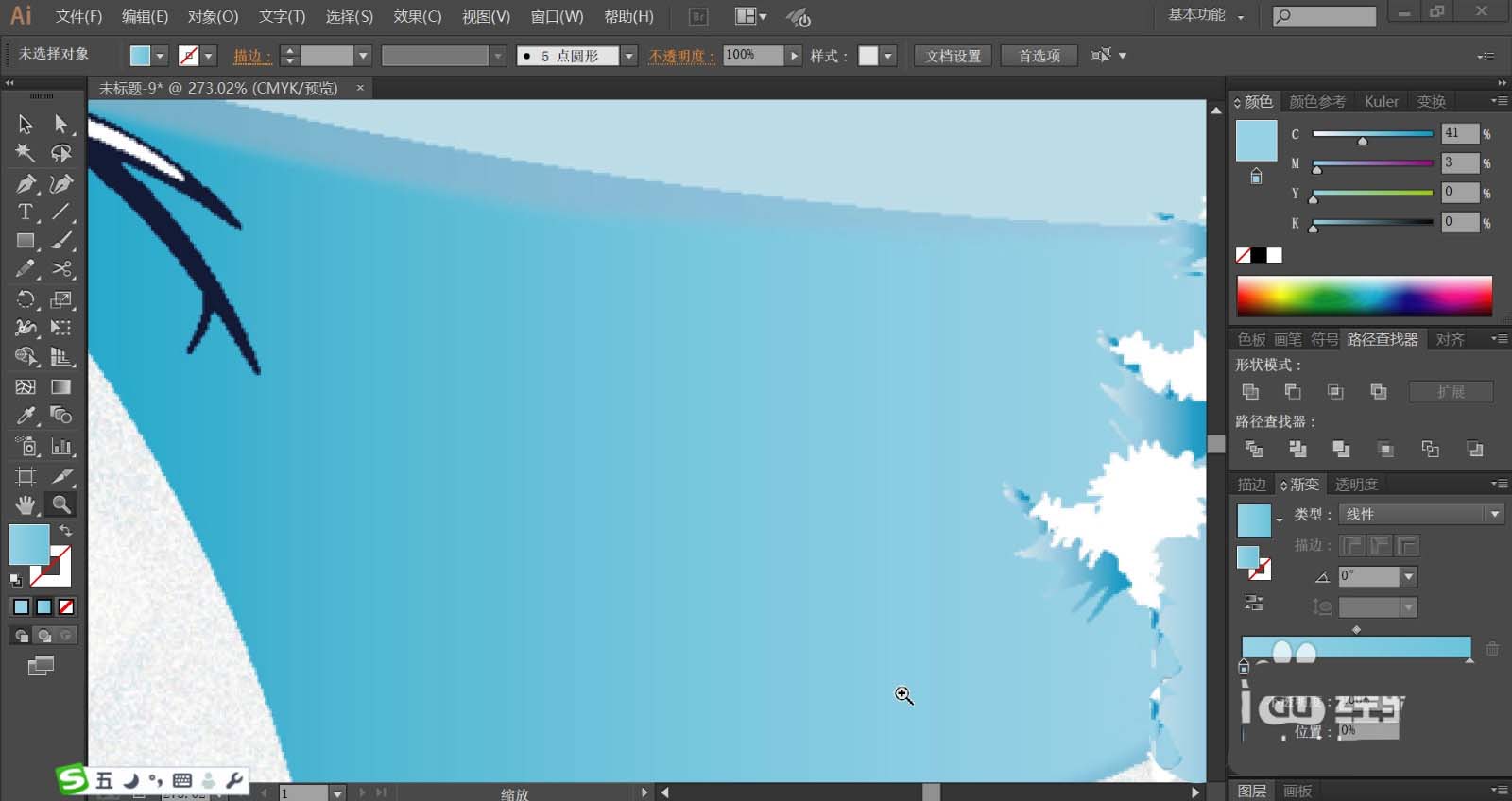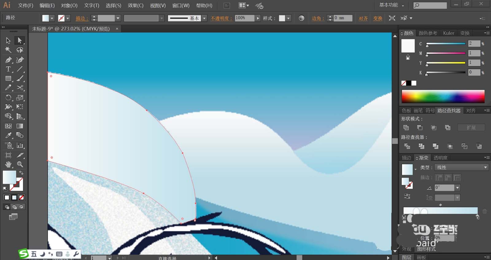 6、繼續(xù)使用鋼筆在右側(cè)河面上繪制出冰塊的路徑,我們用正片疊底的天藍(lán)色漸變填充,勾勒出冰面上的雪花的路徑再用白色填充。