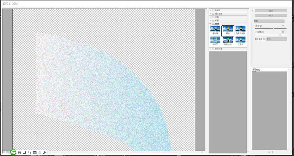 4、選擇近處的雪山路徑,我們使用一下顆粒濾鏡,讓雪山上面多了一些類似雪花效果的顆粒,設(shè)置好參數(shù)再點(diǎn)擊確定按鈕。