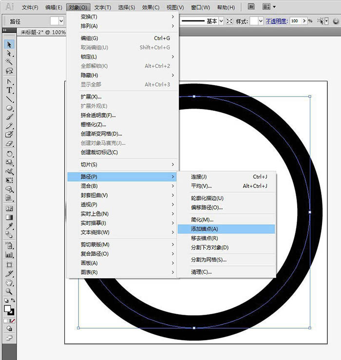 3、選中正圓,執(zhí)行對(duì)象→路徑→添加錨點(diǎn),執(zhí)行兩次,如圖。