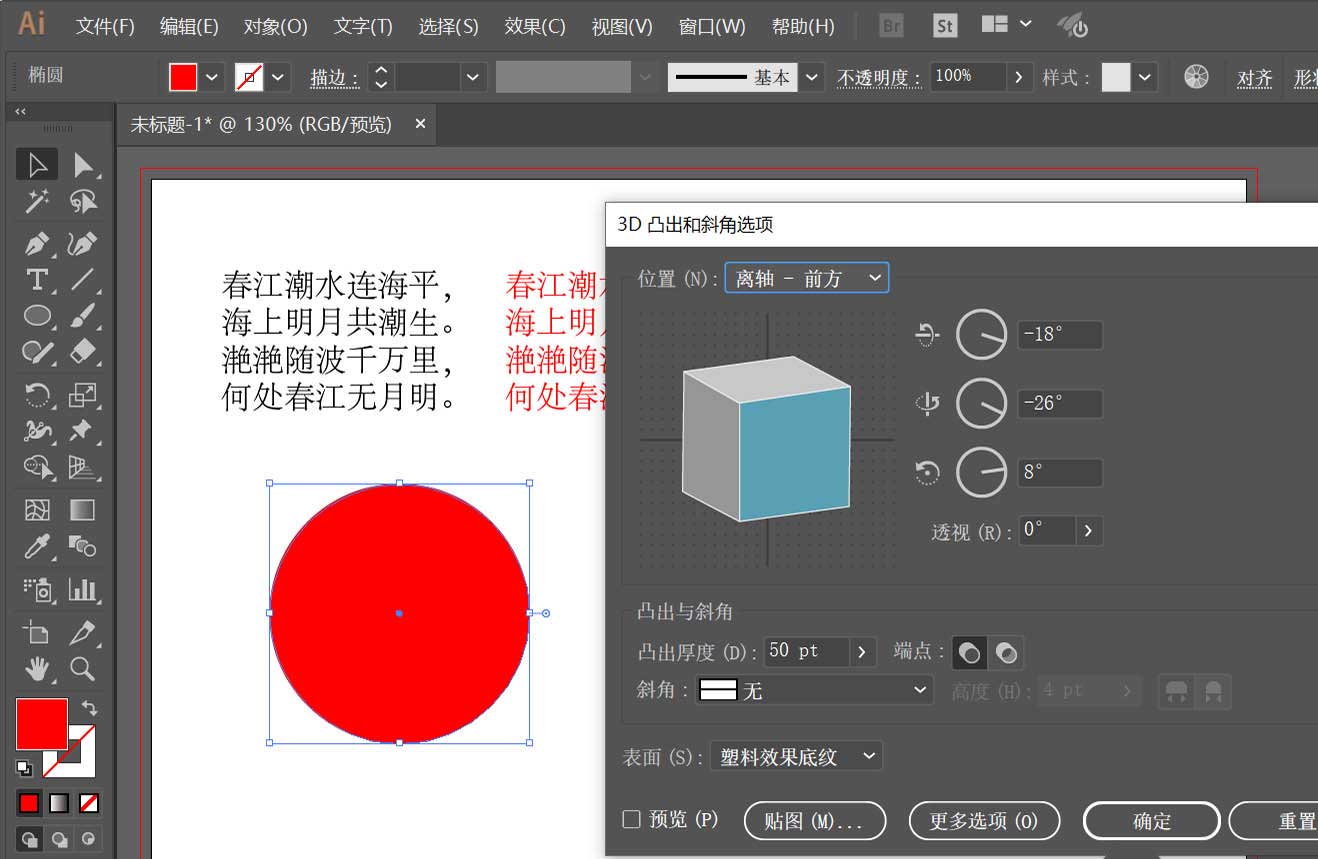4、使用橢圓工具繪制一個(gè)圓形,并依次執(zhí)行效果-3D-凸出和斜角操作;