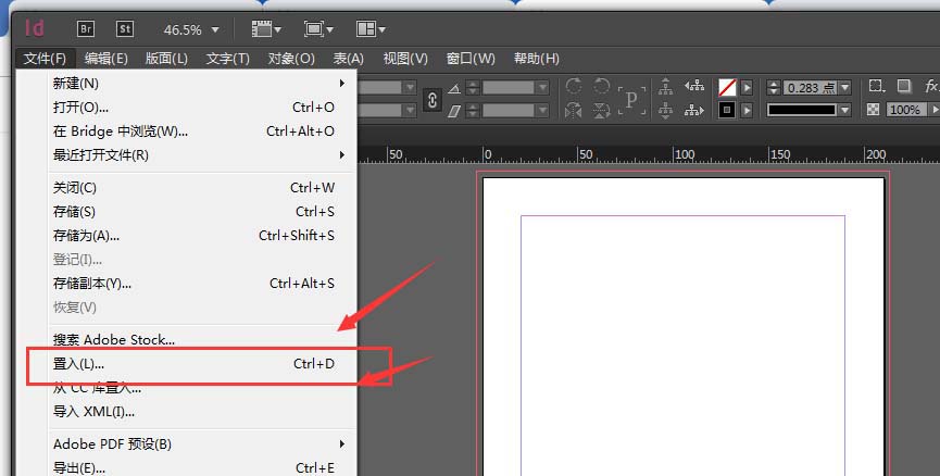 1、如圖,打開ID進入到工作區(qū),選擇置入命令。