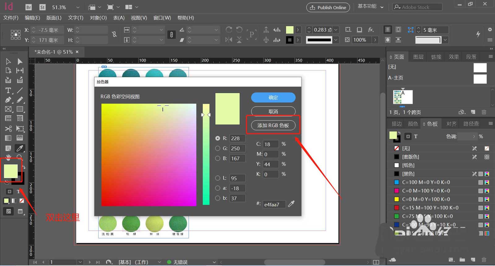 7、也可雙擊填色,在彈出的拾色器中點擊添加到RGB色板進行顏色添加。