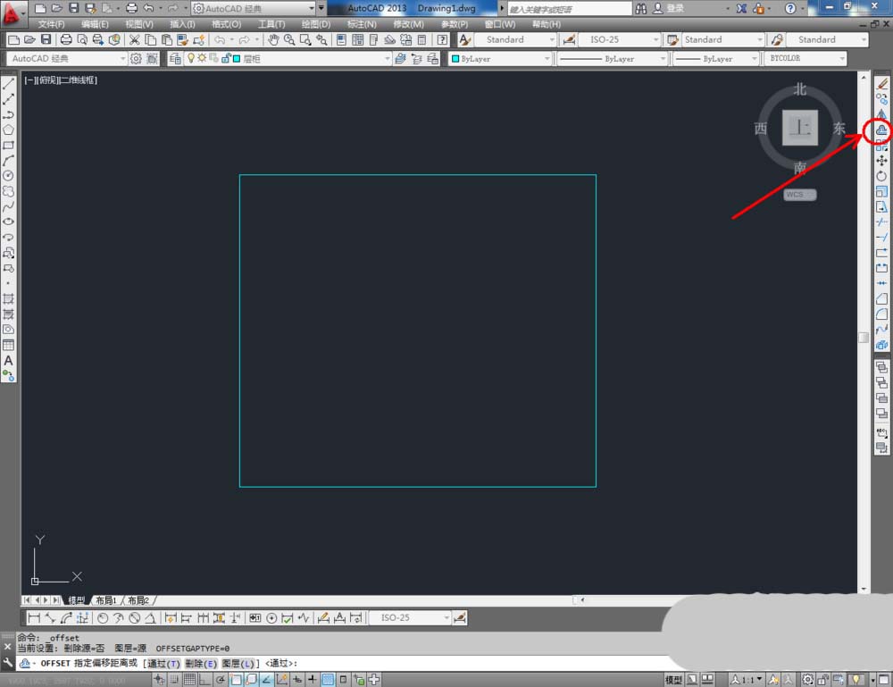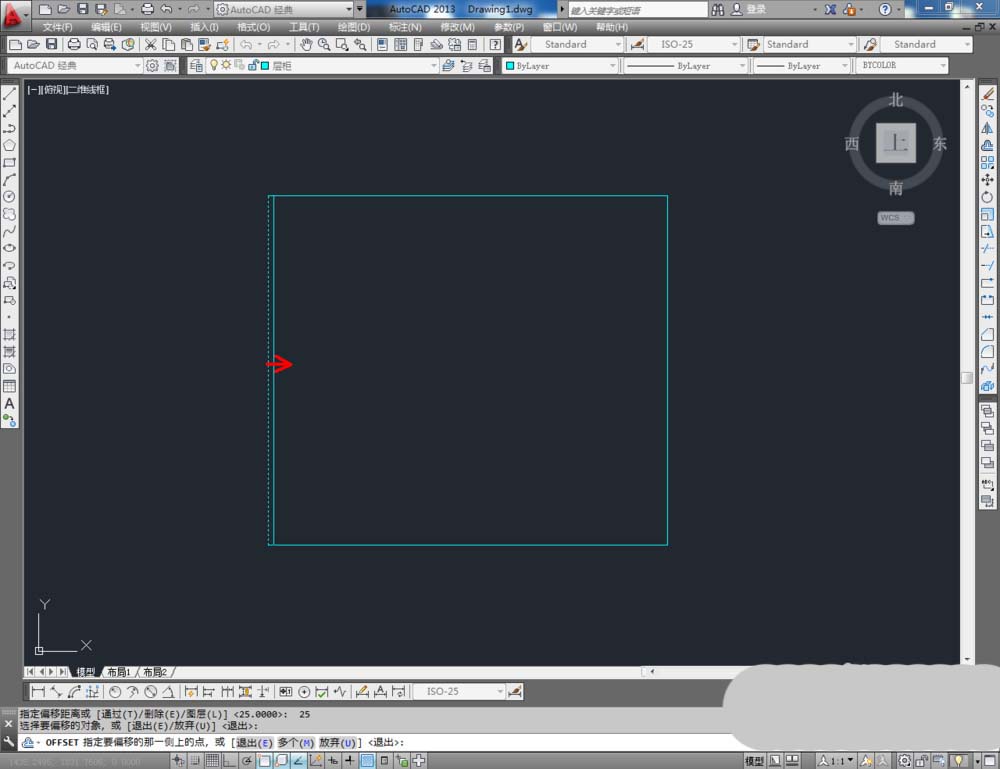 3、點(diǎn)擊右邊工具欄中的【偏移工具】,在命令欄輸入數(shù)值:25后,對(duì)側(cè)邊進(jìn)行向內(nèi)偏移。繼續(xù)點(diǎn)擊【偏移工具】,在命令欄輸入偏移數(shù)值:80后,對(duì)圖案底邊進(jìn)行向上偏移;輸入數(shù)值:50,對(duì)圖案頂邊進(jìn)行向上偏移,并調(diào)整好左右兩條側(cè)邊上的端點(diǎn)(如圖所示);