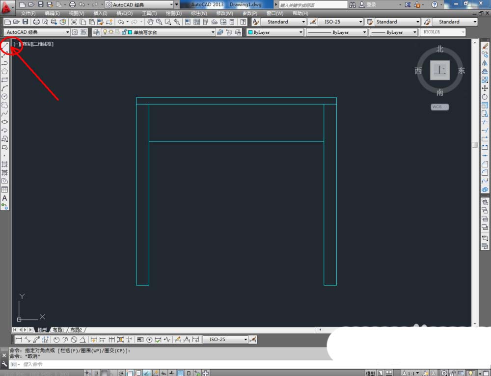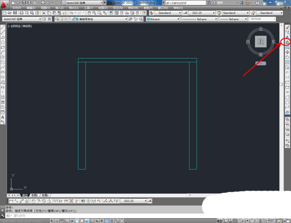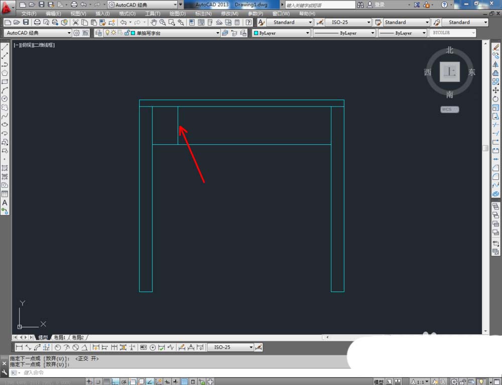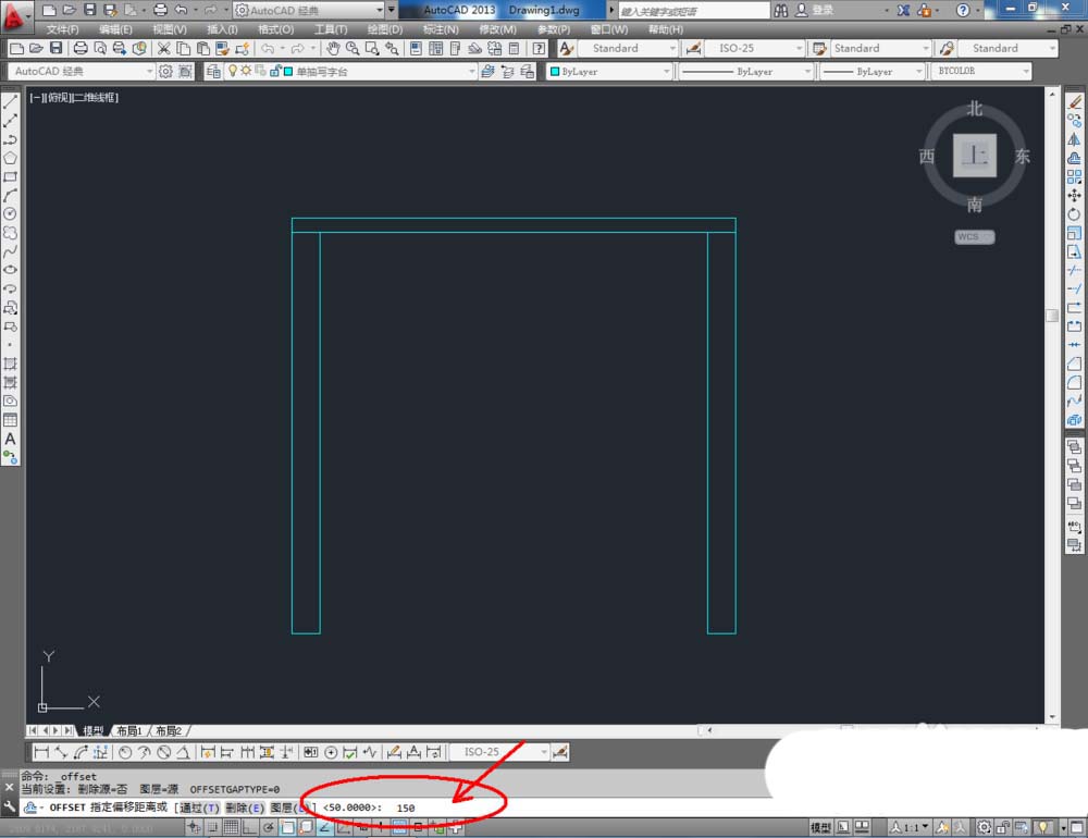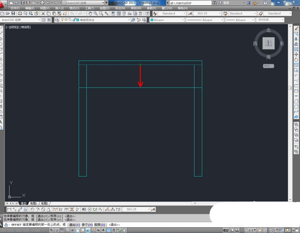 3、點擊右邊工具欄中的【偏移工具】,在命令欄輸入偏移數值:25后,對頂邊進行向下偏移。在命令欄輸入偏移數值:50后,對側邊進行向內偏移。點擊【修剪】對圖示線段進行修剪(如圖所示);