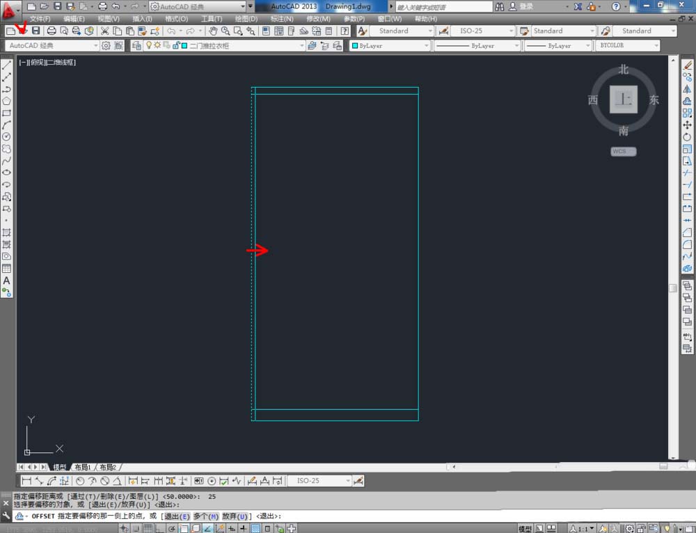 4、繼續(xù)點(diǎn)擊右邊工具欄中的【偏移工具】,在命令欄輸入偏移數(shù)值:25后,對(duì)兩側(cè)邊進(jìn)行向內(nèi)偏移。完成后,點(diǎn)擊【修剪】對(duì)圖示線段進(jìn)行修剪(如圖所示);