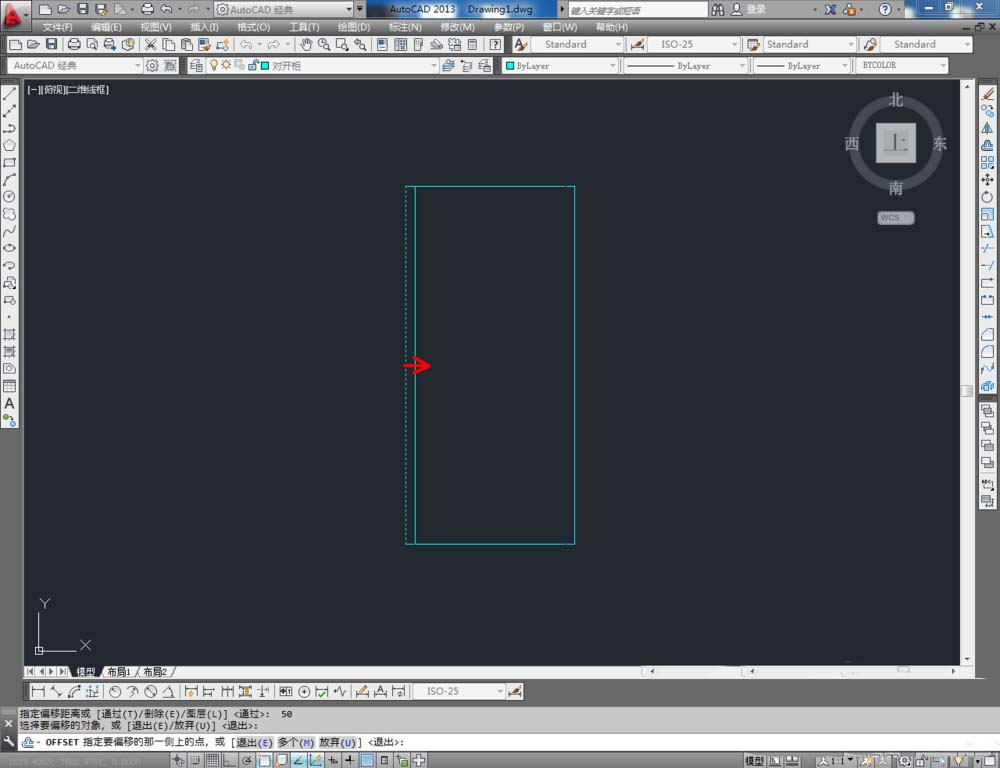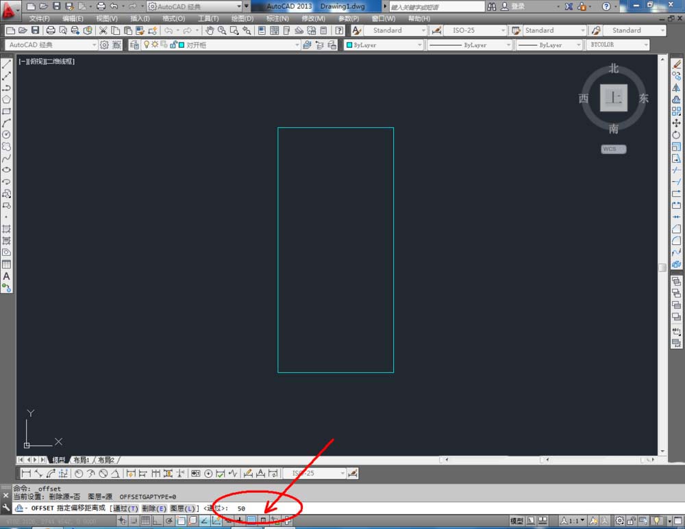 3、點擊右邊工具欄中的【偏移】,在命令欄中輸入: 50,選中圖案側(cè)邊和頂邊,依次對側(cè)邊和頂邊進行向內(nèi)偏移。在命令欄中輸入:80,選中底邊,將底邊進行向上偏移(如圖所示);