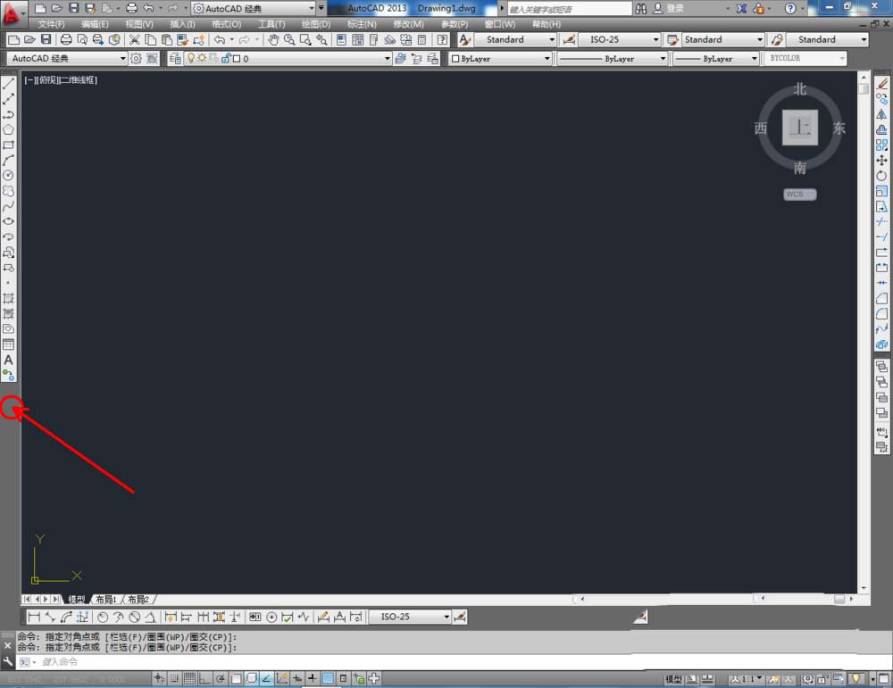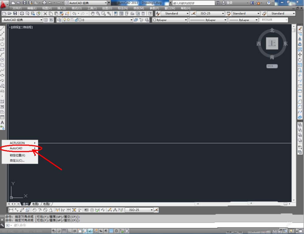 1、打開AutoCAD 2013軟件,鼠標(biāo)移動到圖示區(qū)域,點(diǎn)擊鼠標(biāo)右鍵-【AutoCAD】,勾選【視圖】、【視覺樣式】和【三維導(dǎo)航】,將這三個(gè)工具欄調(diào)出并按圖示調(diào)整好工具欄的位置;