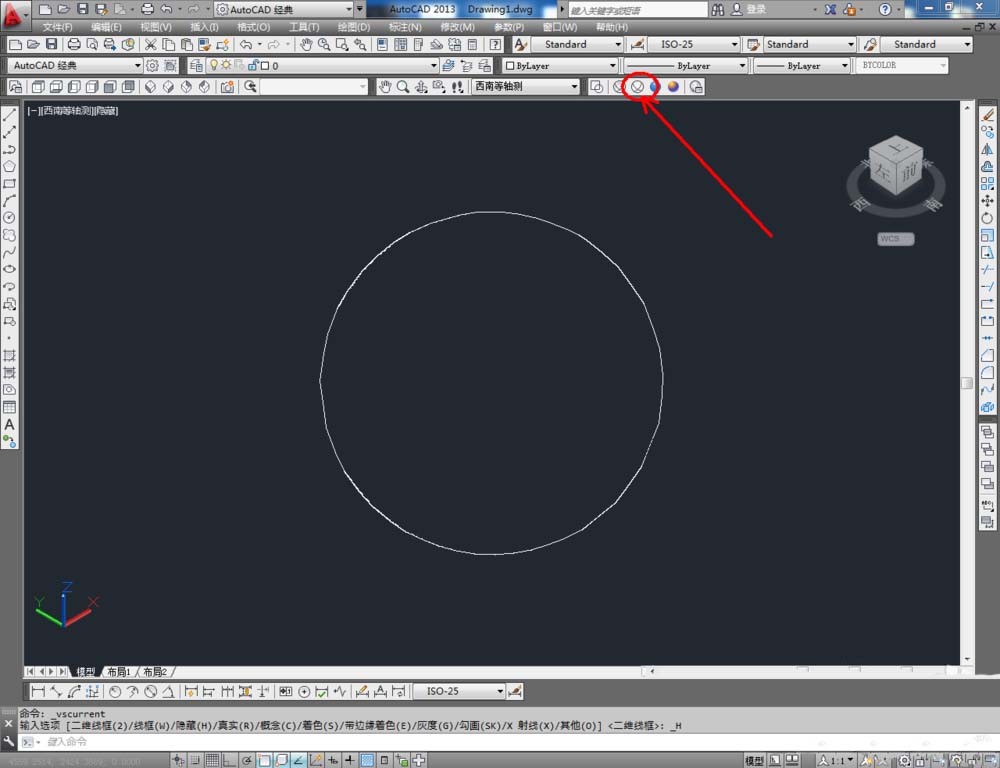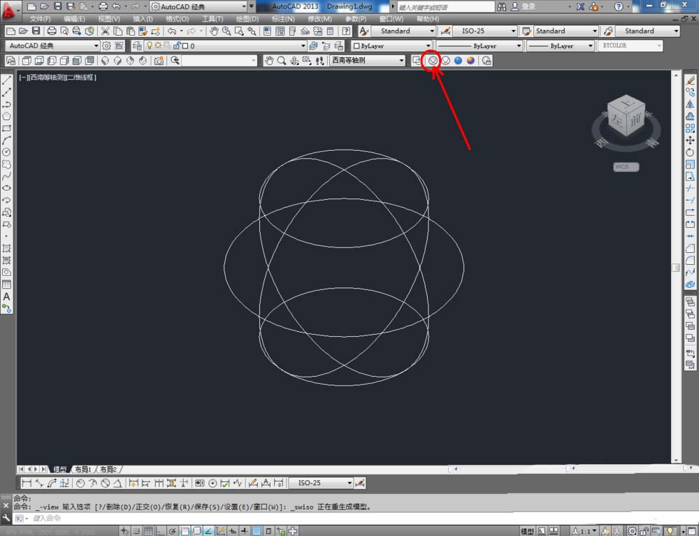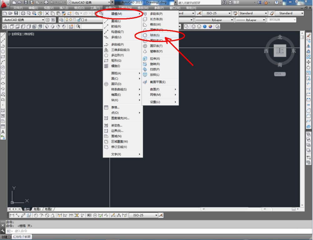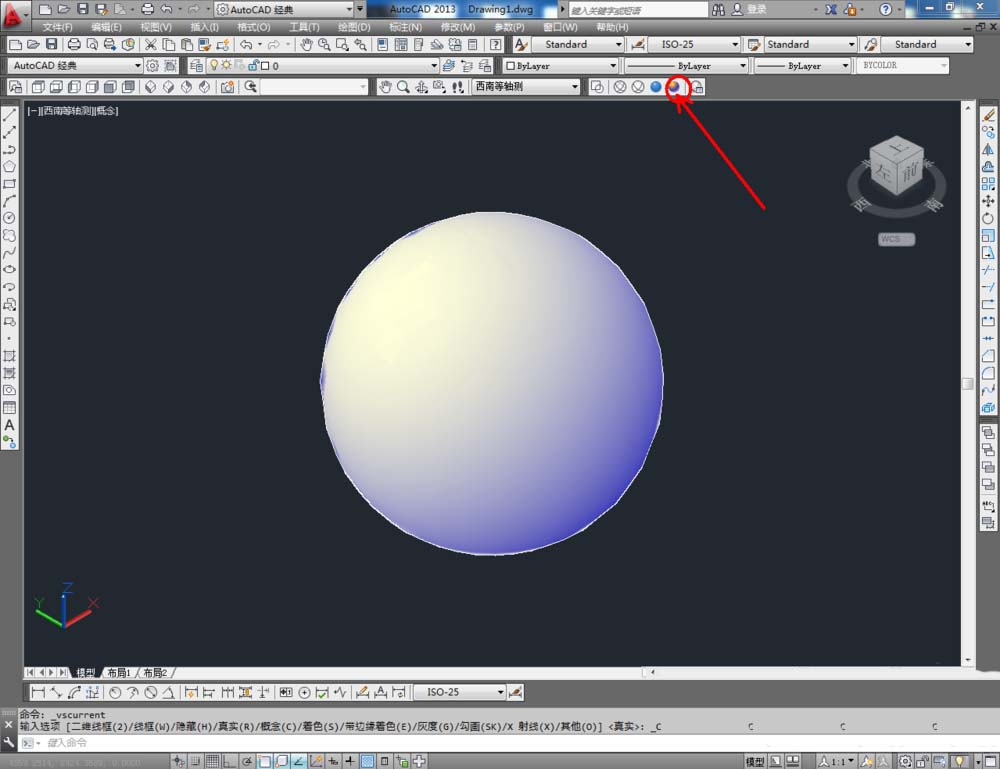 2、點(diǎn)擊【繪圖】-【建?!?【圓錐體】,按圖示在作圖區(qū)域繪制一個(gè)球體模型。完成后,點(diǎn)擊視圖欄中的【西南等軸測】將視圖切換為西南視角并觀察球體模型(如圖所示);