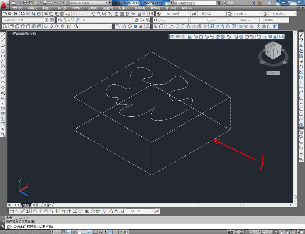 5、點擊實體編輯工具欄中的【壓印】工具,首先鼠標(biāo)點擊拾取長方體模型,接著點擊拾取自定義圖案并按下空格鍵確認(rèn),完成對模型的壓印操作。壓印完成后,我們就可以對模型上的面進(jìn)行拉伸擠出操作了。