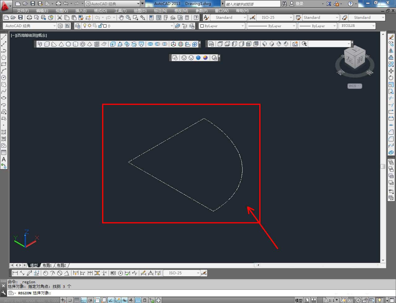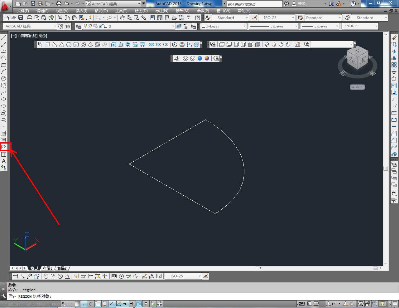4、點擊【面域工具】,框選扇形圖案并按下空格鍵確認(rèn),完成扇形面的制作(如圖所示);