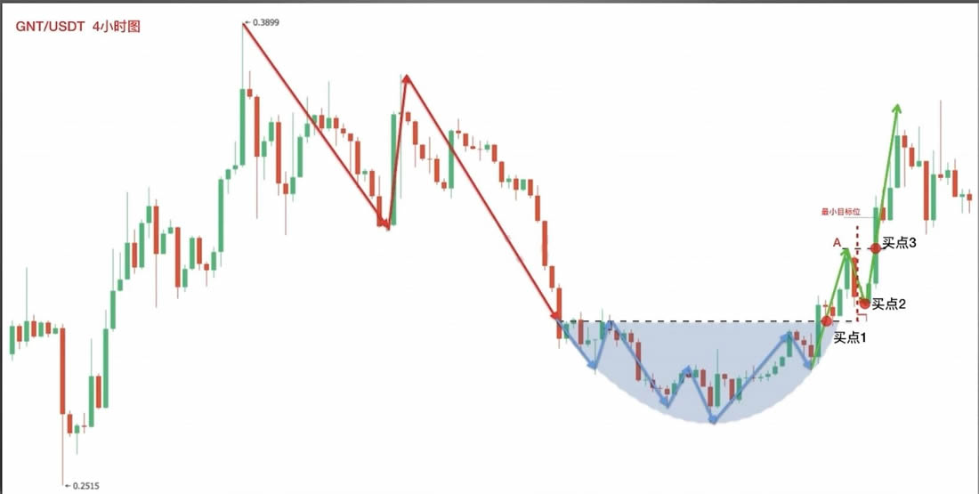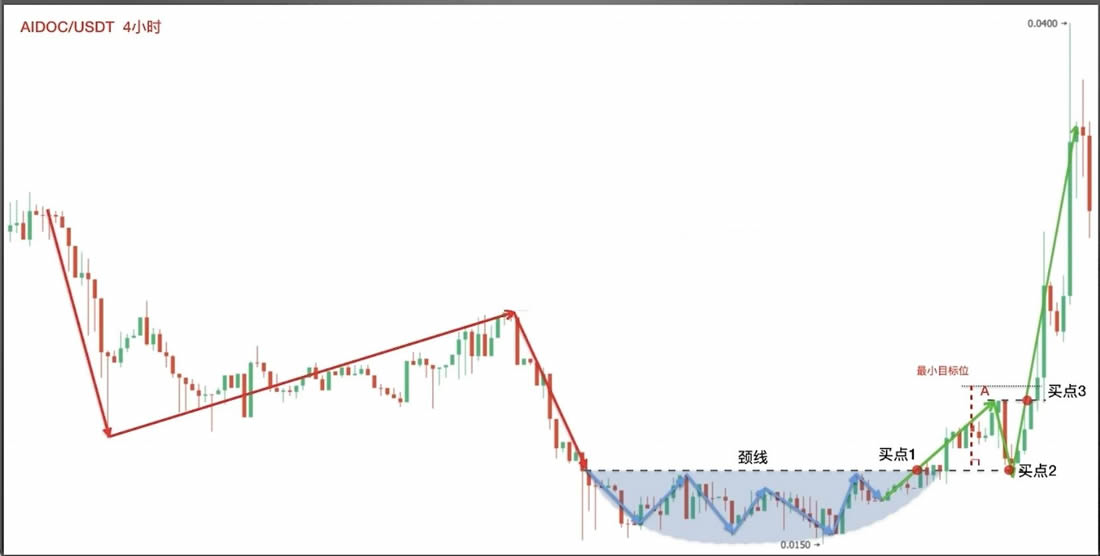 案例二:截圖是 AIDOC/USDT 4小時(shí)圖,圓弧底出現(xiàn)在下跌行情尾部,成為反轉(zhuǎn)形態(tài),并出現(xiàn)教科書(shū)一般的三個(gè)買(mǎi)點(diǎn)。最終上漲幅度遠(yuǎn)超最小預(yù)測(cè)目標(biāo)。