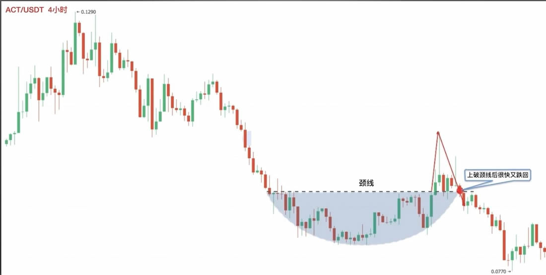 圖二為 ACT/USDT 4小時(shí)圖,幣價(jià)雖然站上頸線,但回踩頸線之后并未出現(xiàn)更強(qiáng)勢(shì)的上漲,最終再次跌至頸線之下,圓弧底構(gòu)筑失敗,價(jià)格持續(xù)走低。