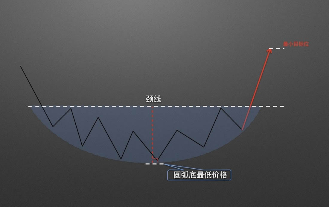 圓弧底的最小目標(biāo)位很容易確立,即頸線到圓弧形態(tài)底部的垂直距離,如圖所示。