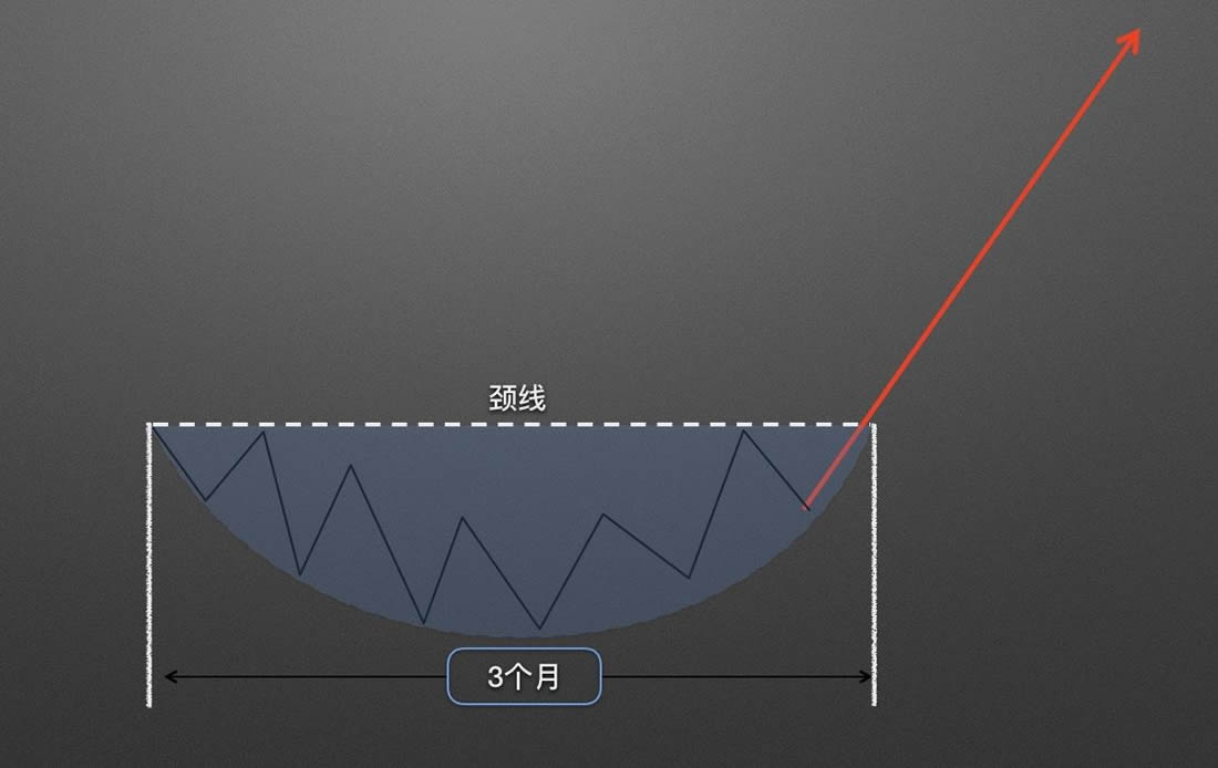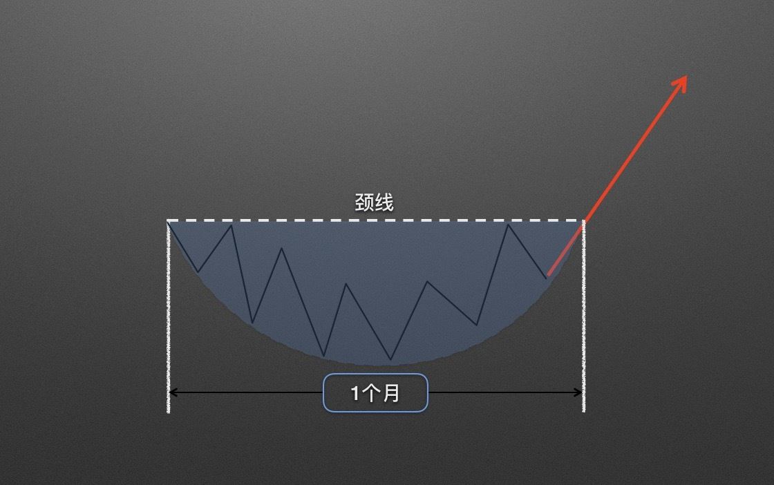如圖所示,當(dāng)某根上漲K線收線后,實(shí)體壓過(guò)頸線,才可以認(rèn)定圓弧底成立。