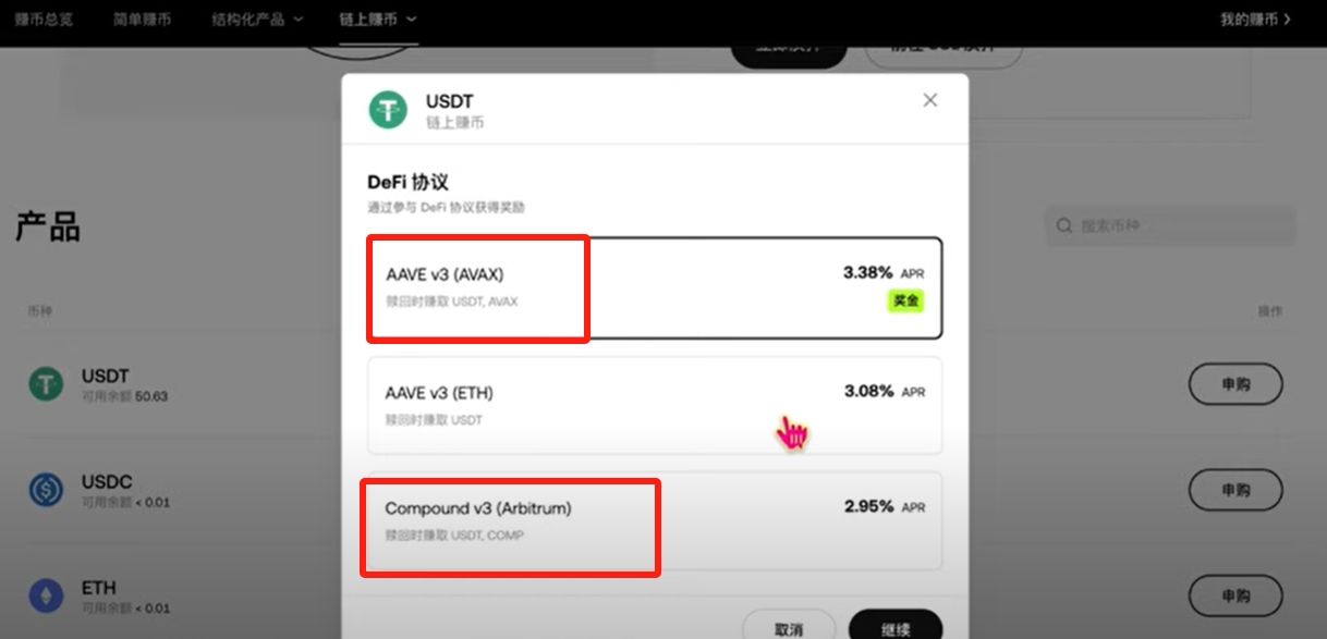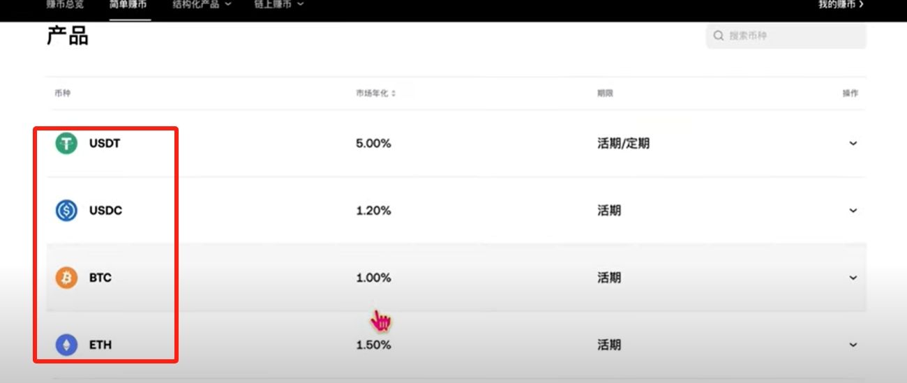 它具體有哪些產(chǎn)品呢?這里最穩(wěn)健的肯定是USDT跟USDC,因?yàn)橹挥羞@倆是穩(wěn)定幣,價(jià)格基本上不會(huì)有波動(dòng)。主流幣有比特幣跟以太坊,但是利率就非常低了。