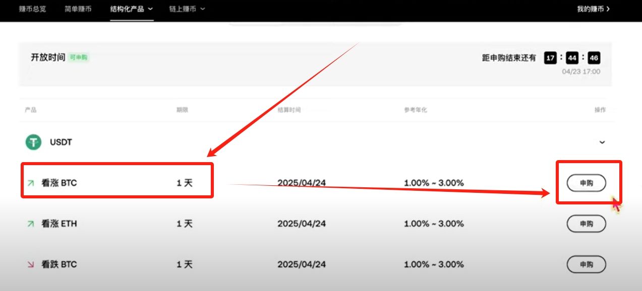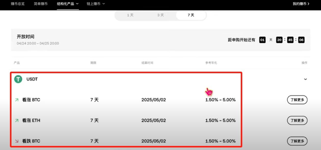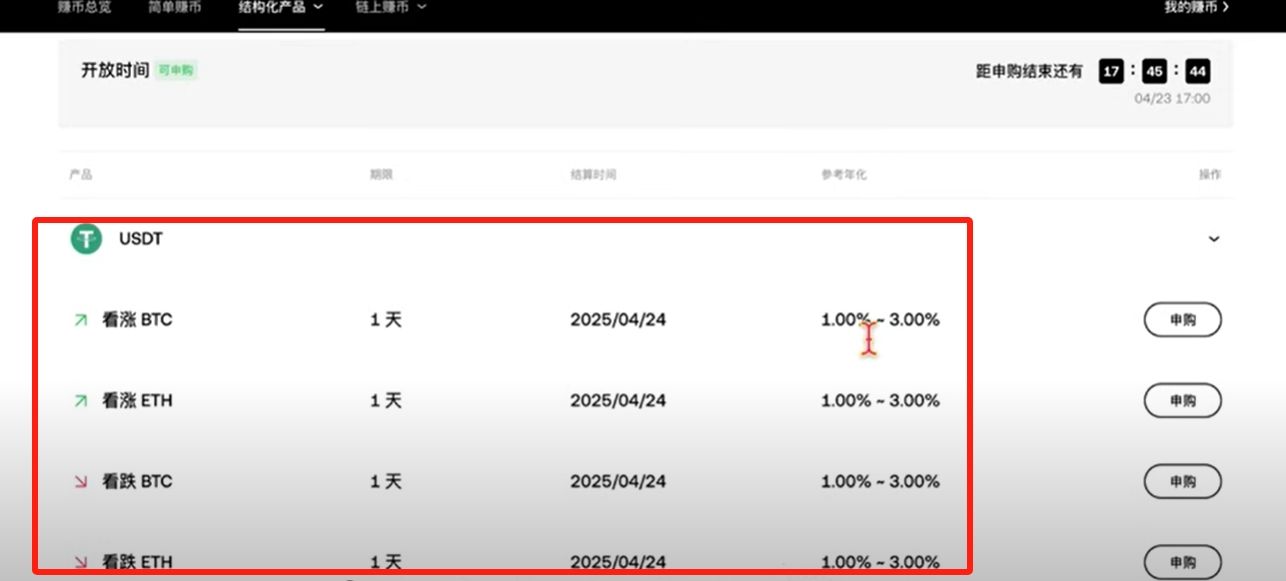 一天你就只能夠去買USDT這個(gè)產(chǎn)品,其實(shí)我們一般也就是買這個(gè)產(chǎn)品。而且一天這個(gè)封閉期是剛推出沒有多久,這個(gè)其實(shí)是非常好的,因?yàn)樗旧礞i定的時(shí)間就短,你的靈活度就會(huì)更加高。對(duì)應(yīng)的標(biāo)的是比特幣跟以太坊看漲或者是看跌,你就根據(jù)自己的判斷來選擇,反正你選對(duì)選錯(cuò)最終都是保本的。如果你選擇總體來說是對(duì)的,那你整體的收益會(huì)更高一些。它參考的年化目前看并不高,1%-3%。但是利率他是會(huì)隨時(shí)調(diào)整的,如果行情比較好的話,他也會(huì)變得比較高。