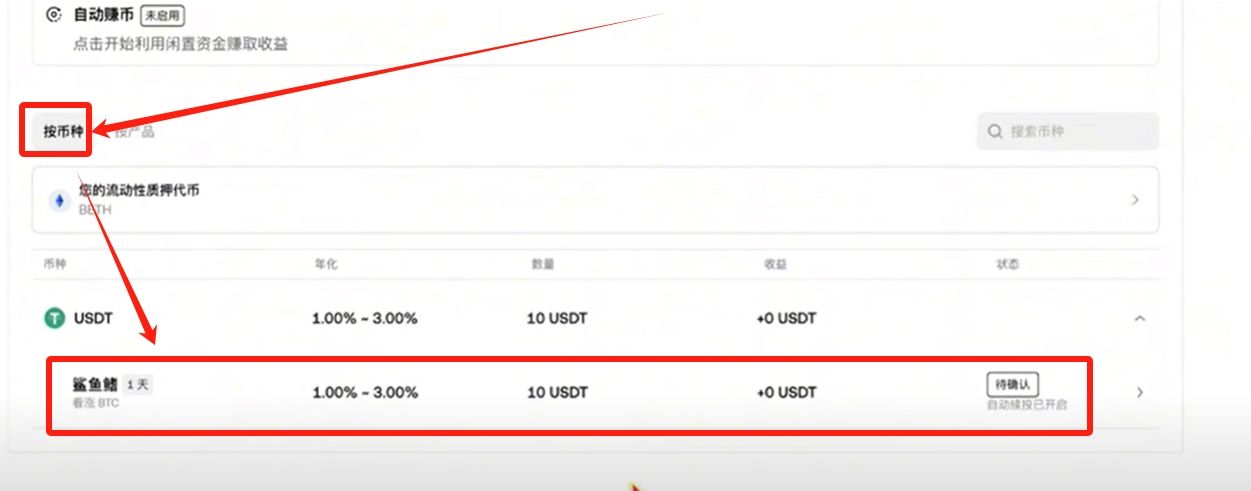 往下捯,在“按幣種”里面你能夠找到USDT底下這些購(gòu)買的產(chǎn)品,這里面就會(huì)有你買的各種鯊魚鰭。比如說這里面有一個(gè)即將到期的一天的封閉期的。