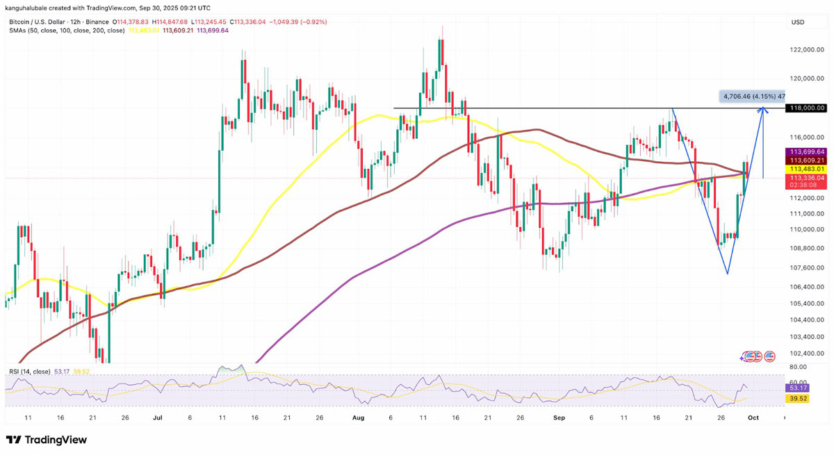自9月18日以來,比特幣走勢在12小時圖上形成V型反轉(zhuǎn)。此前,比特幣一度下跌7.8%,于周四觸及108,700美元低點。