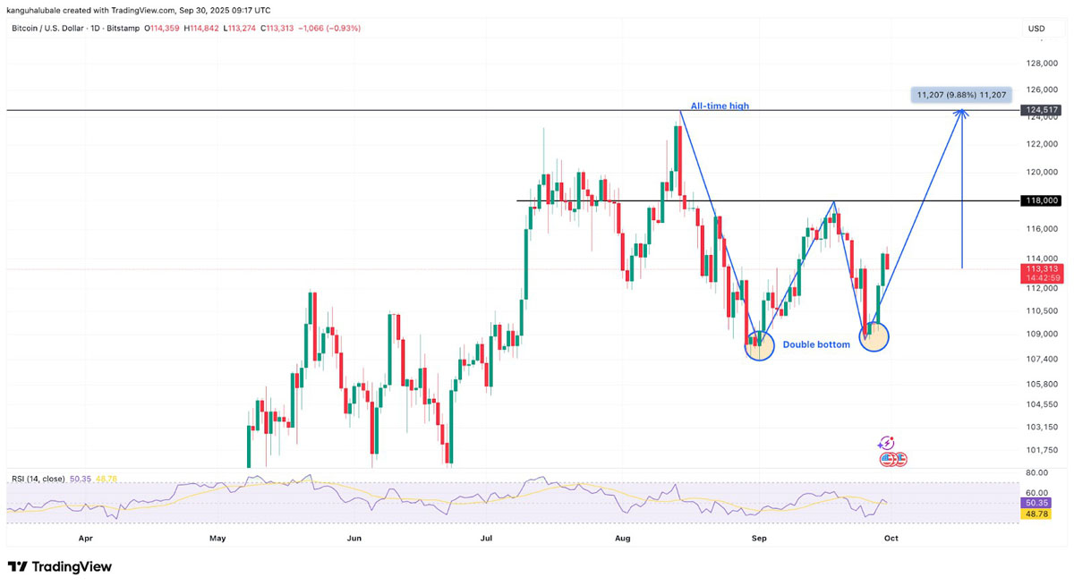 - 比特幣的V形和雙底圖表模式暗示短期內(nèi)可能上漲至118,000美元至124,500美元。