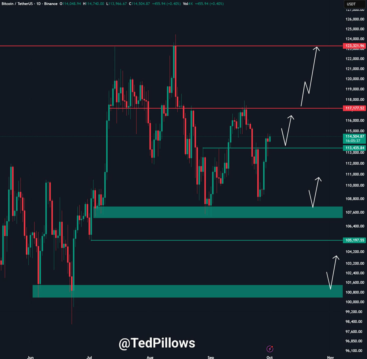 加密貨幣分析師兼企業(yè)家Ted Pillows在其最新X平臺上發(fā)布的一篇分析中寫道:“下一個(gè)主要阻力位約在11.7500萬美元,如果BTC重新站上該位置,將會沖向新的歷史高點(diǎn)。”