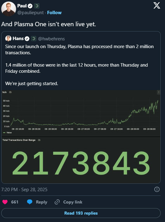 Plasma 在主網(wǎng)上線與 TVL 的快速增長中交出了一份亮眼的成績單。網(wǎng)絡(luò)在一周內(nèi)鎖倉價值接近 60 億美元,吸引了多個主流 DeFi 協(xié)議,并推出面向消費者的數(shù)字銀行應(yīng)用。這些成果顯示,這個項目并非僅僅是炒作。
