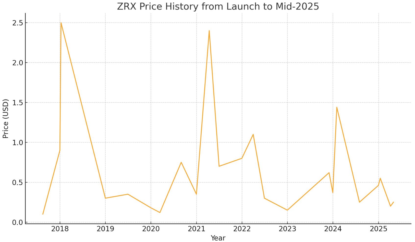 2017年至2025年中期ZRX的歷史價(jià)格表現(xiàn)(以美元計(jì))。該圖表突出顯示2018年初和2021年的主要高峰和隨后的波動性。