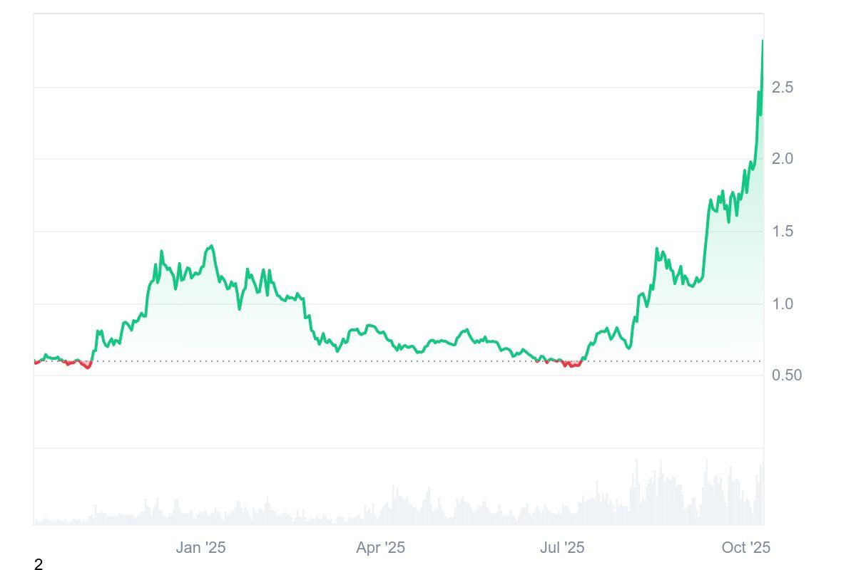 2025年,Mantle (MNT) 成為大型數(shù)字資產(chǎn)中最引人注目的漲幅之一。短短幾個月內(nèi),該代幣上漲超過360%,交易價(jià)格接近2.85美元,市值突破90億美元。這一表現(xiàn)使Mantle躋身前20 大加密貨幣之列,對于一個2023年才上線的網(wǎng)絡(luò)來說,這是一個非凡的成就。