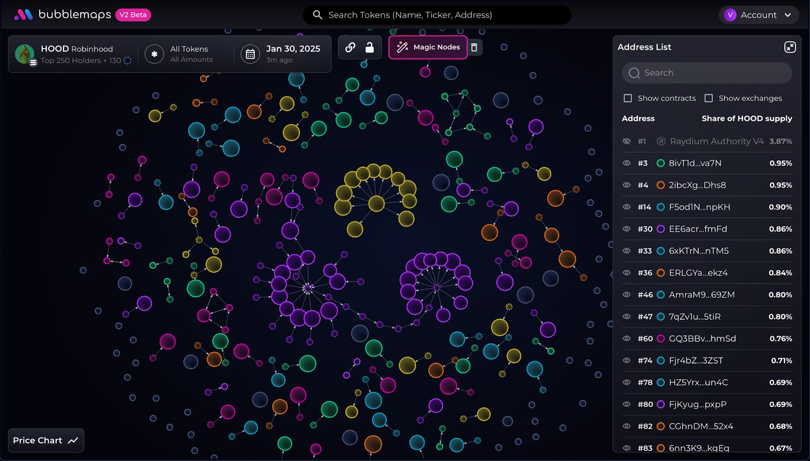 默認情況下,可視化工具會顯示代幣的前 150 名持有者。代表合約或交易所的氣泡會自動隱藏。不過,用戶可以通過點擊地址或名稱旁邊的眼睛圖標來顯示它們。