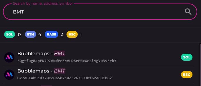 首先,搜索代幣或錢包地址。在本例中,我們使用了 BMT(Bubblemaps 的原生代幣),該代幣在BNB Chain和Solana網(wǎng)絡上均可使用。