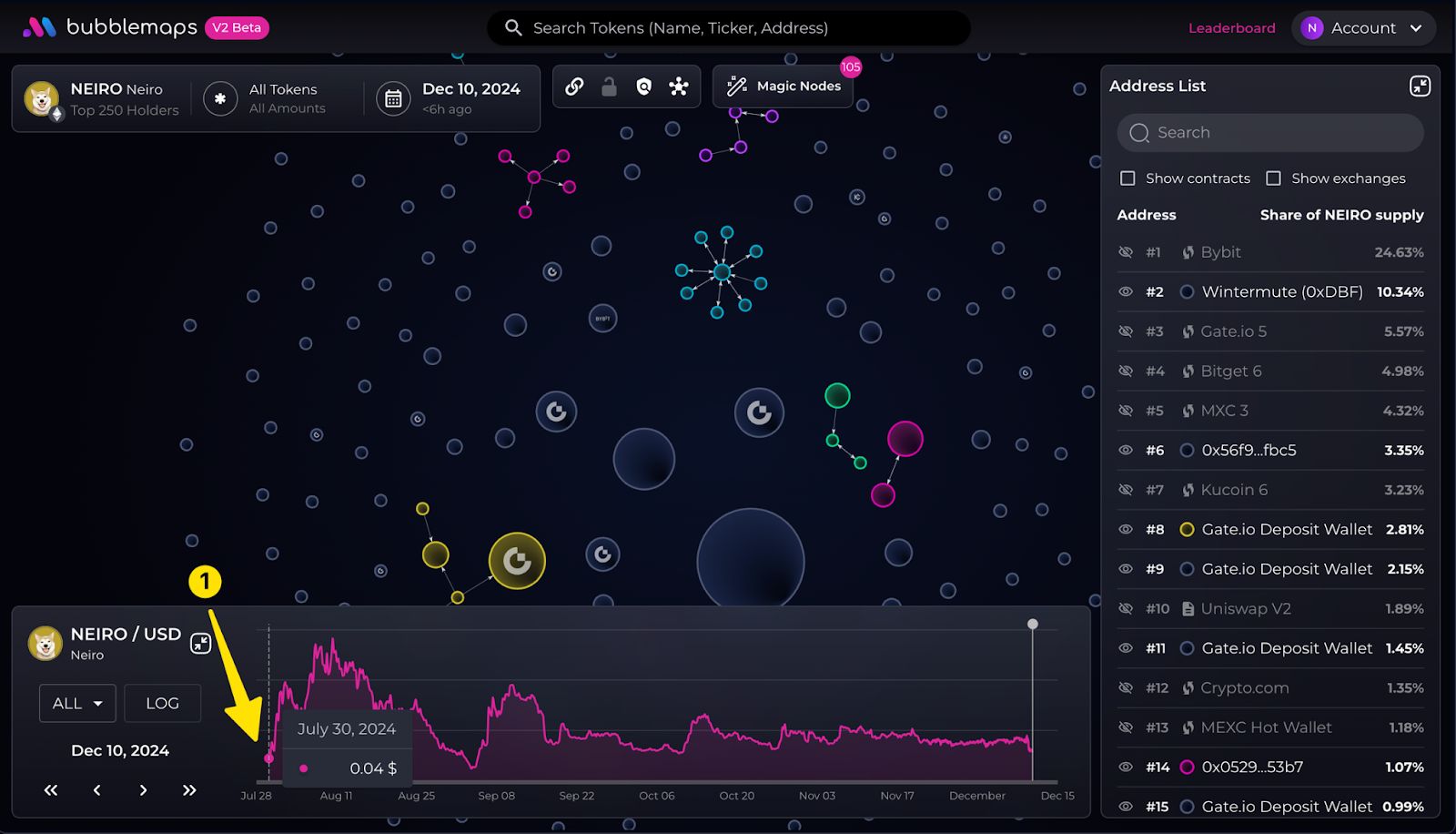 Bubblemaps上的時間旅行功能(NEIRO 代幣)。來源:wiki.bubblemaps.io