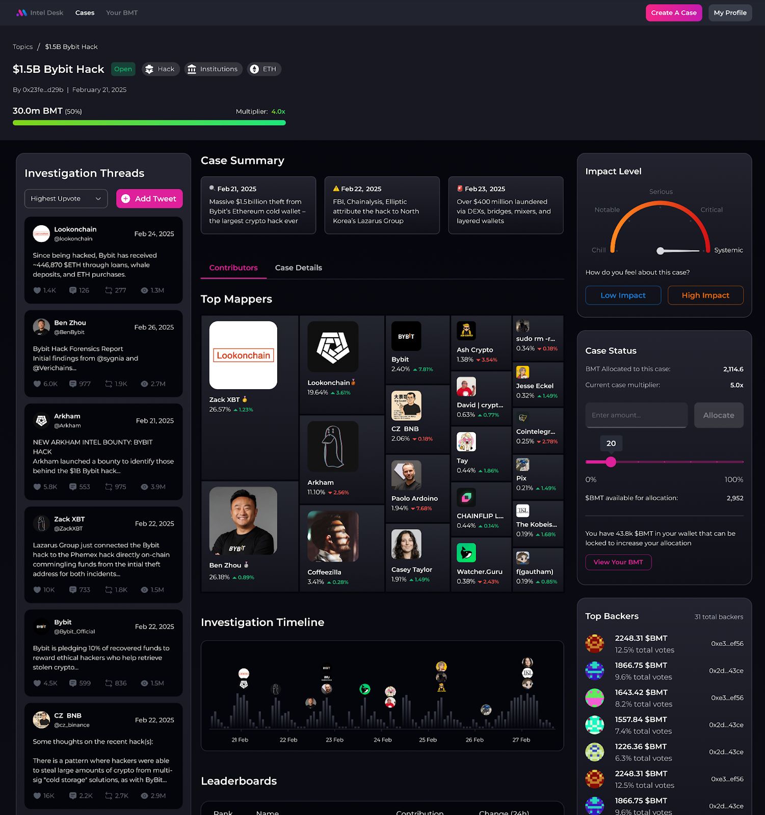 案件貢獻者的排名基于影響力、覆蓋范圍和時間。提供有用證據(jù)的推文或分析將獲得積分,積分乘以案件分數(shù)。這確保最有價值的研究排名靠前,而較弱或無法證實的論點則會被過濾掉。推動案件進展的調查人員將獲得 BMT 的認可和獎勵,而資助的賞金將使社區(qū)能夠支持對高優(yōu)先級主題進行更深入的調查。