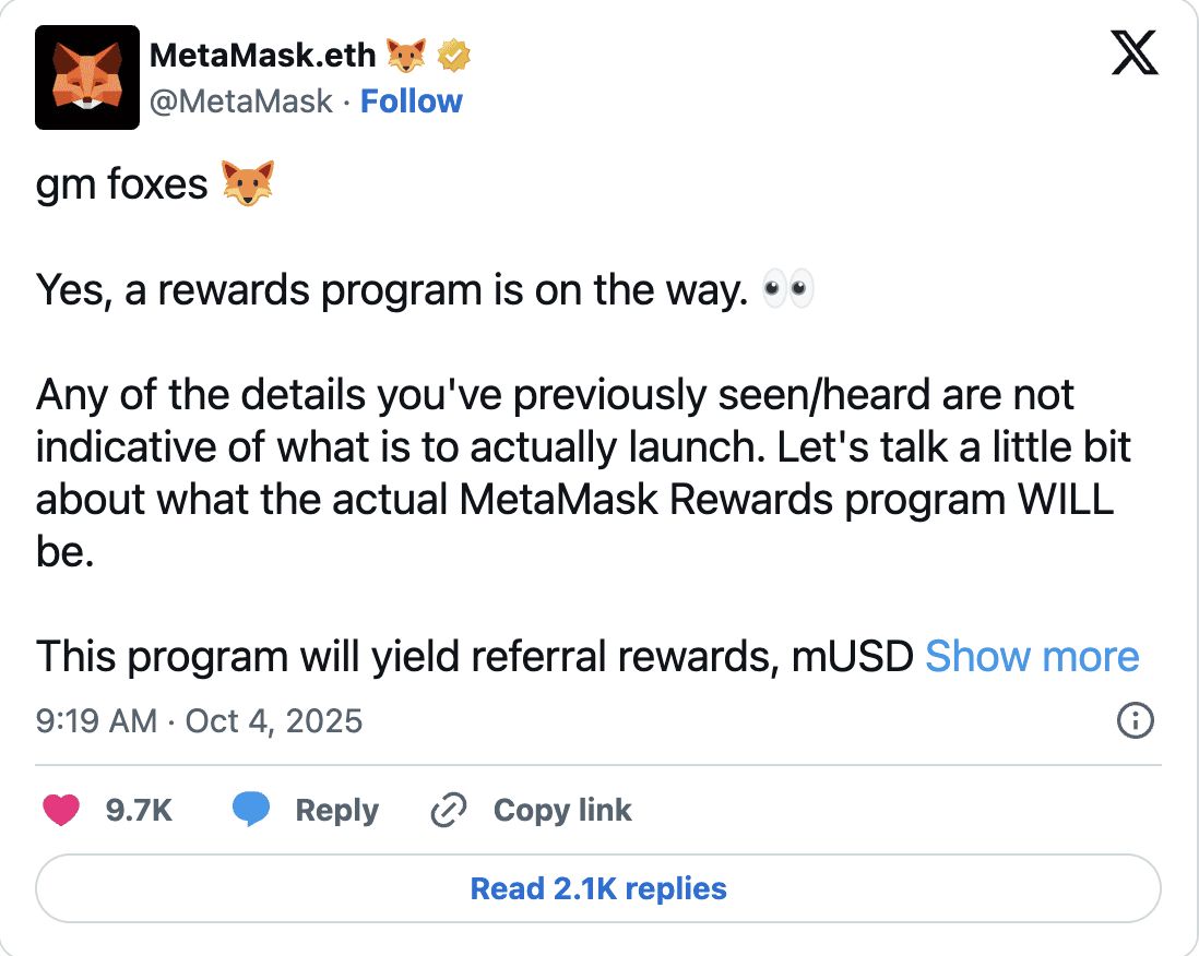 當(dāng)全球最受歡迎的非托管錢包之一決定發(fā)行自己的穩(wěn)定幣時(shí),會(huì)發(fā)生什么?這正是我們?cè)贛etaMask 全新的mUSD 上看到的,該穩(wěn)定幣已于2025 年9 月15 日(星期一)正式上線,正如C…