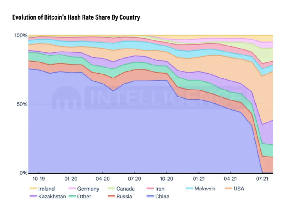 2021 年,監(jiān)管力度進(jìn)一步升級,在最初的監(jiān)管基礎(chǔ)上,2021 年 5 月,金融機構(gòu)和支付公司被禁止提供與加密貨幣相關(guān)的服務(wù)。2021 年 6 月,內(nèi)蒙古、新疆和四川等主要挖礦中心出臺了一項打擊比特幣挖礦活動的措施,理由是電力消耗對環(huán)境造成影響。此次打擊導(dǎo)致中國大型比特幣挖礦公司大批遷往哈薩克斯坦和俄羅斯等鄰國,這些國家目前占據(jù)了全球算力的很大份額。