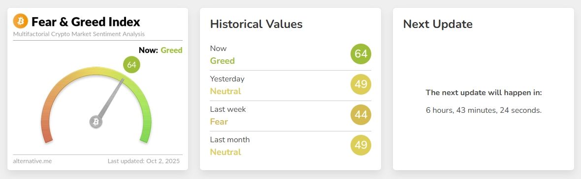 2024 年 12 月迎來另一個里程碑。比特幣觸及 109,000 美元,指數(shù)讀數(shù)為 88(極度貪婪)。但幾個月后出現(xiàn)了有趣的情況:2025 年比特幣進一步推高至約 124,400 美元,這一次指數(shù)僅顯示 68(貪婪),市場情緒明顯冷卻。這表明市場已經(jīng)成熟,機構(gòu)投資者開始進場。這些專業(yè)參與者不像散戶交易者那樣容易被情緒左右。