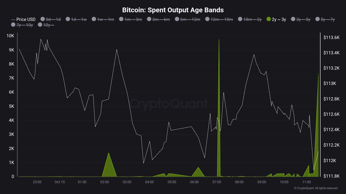 然而,市場(chǎng)分析師發(fā)現(xiàn)年齡較長(zhǎng)的BTC開(kāi)始再次流動(dòng),這引入了短期市場(chǎng)摩擦的潛在因素。本周約7,343枚存在時(shí)間在兩至三年的BTC被重新激活并在鏈上轉(zhuǎn)移,這表明部分長(zhǎng)期持有者可能正在實(shí)現(xiàn)利潤(rùn)或重新調(diào)整投資組合。