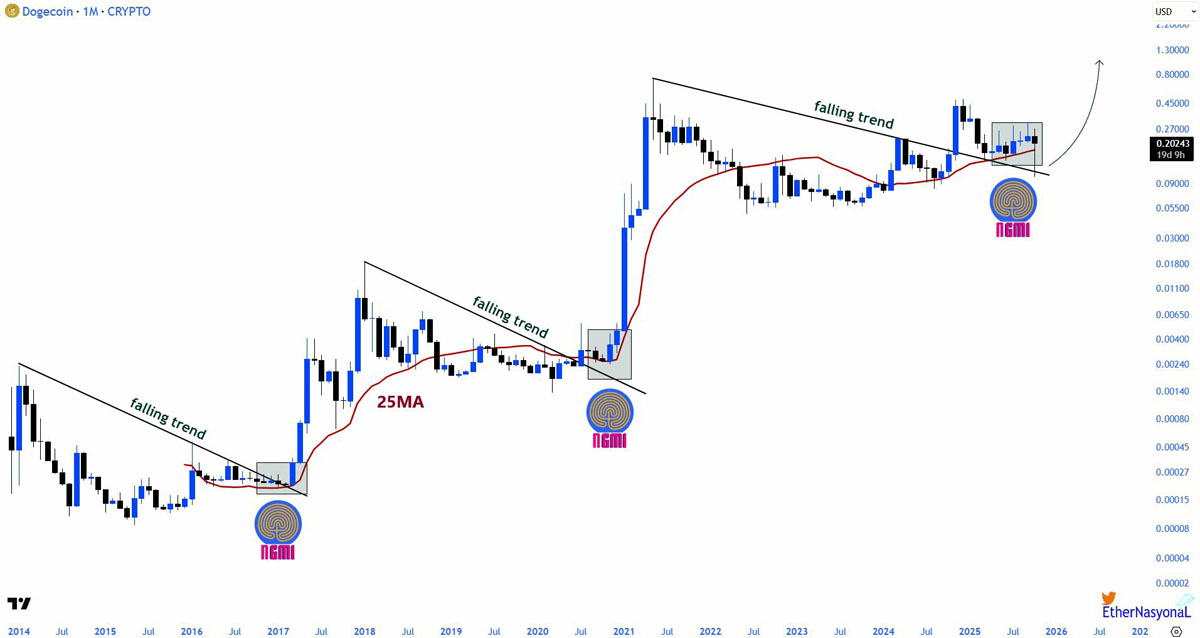 .加密貨幣交易專家EtherNasyonal指出,DOGE歷史上每次重大漲勢都遵循特定模式:在25日移動平均線上方保持穩(wěn)定、突破長期下跌趨勢線,并進入回測階段。他強調,當前市場已滿足所有這些條件,并補充道DOGE通常在市場信心不足和疲態(tài)明顯時開啟其主要上漲周期。