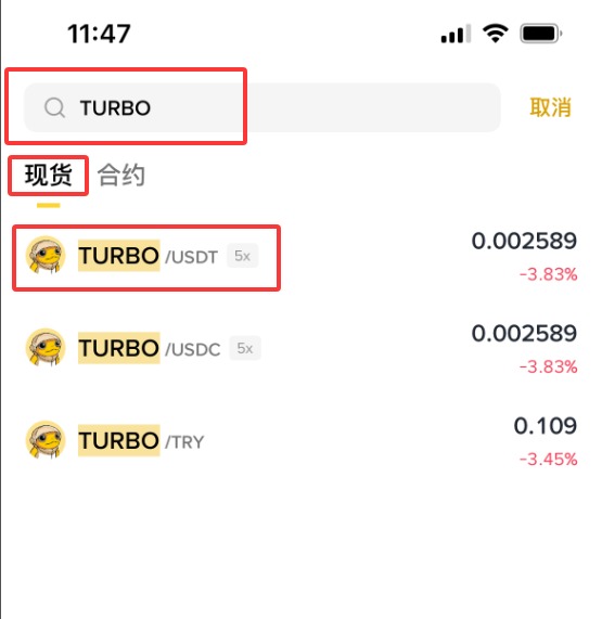 3、輸入【TURBO】,這時(shí)下拉會(huì)顯示【現(xiàn)貨】【TURBO/ USDT】,點(diǎn)擊【TURBO/ USDT】。(作為新手,不建議做合約,所以這里就不演示合約購(gòu)買(mǎi)方式了。)