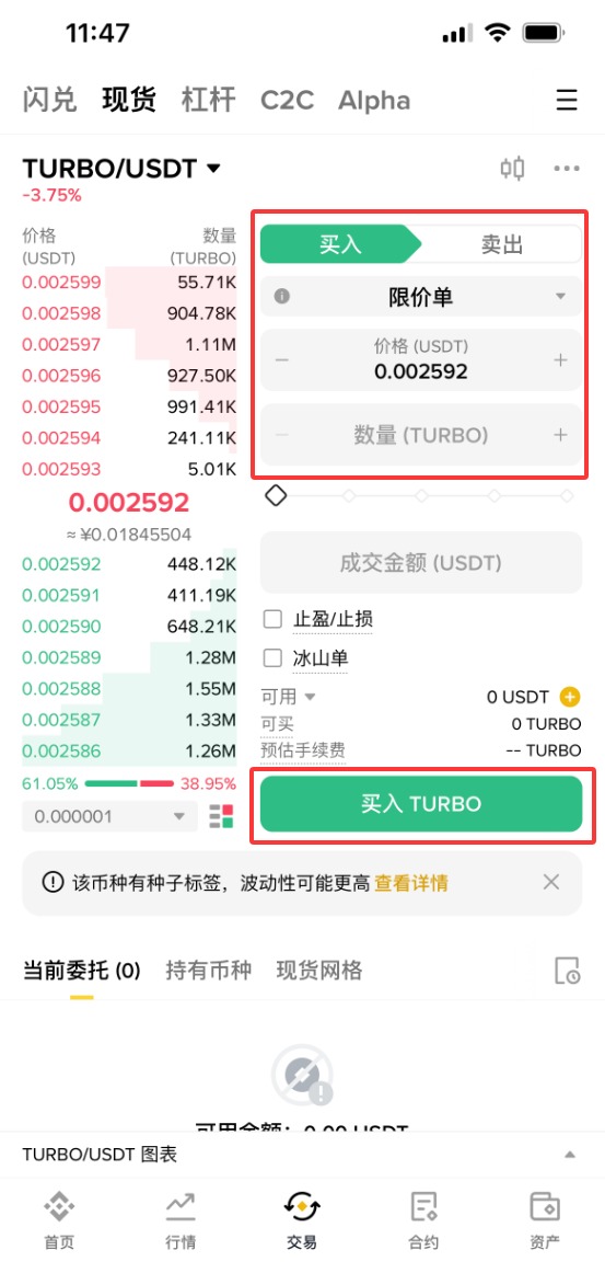 5、依次選擇【限價(jià)單】-購(gòu)買(mǎi)【價(jià)格】-購(gòu)買(mǎi)【數(shù)量】-【成交數(shù)量】,設(shè)置好之后,點(diǎn)擊【買(mǎi)入TURBO】。