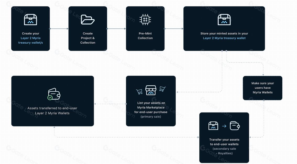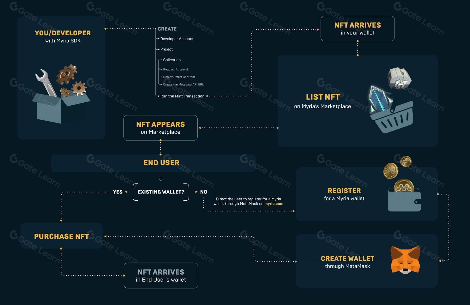 • NFT 市場: 促進 NFT 市場的創(chuàng)建和運營,提供快速、安全且無 Gas 的交易。 Myria 的技術確保這些平臺能夠高效地處理大批量交易。