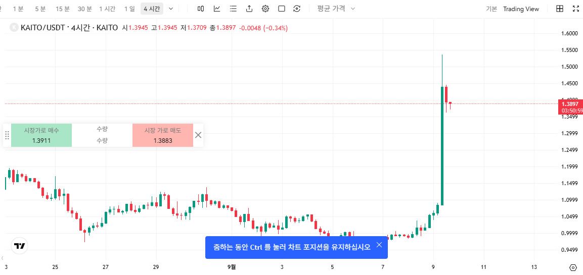 截至9月9日下午4:01(當(dāng)?shù)貢r(shí)間),KAITO幣在BTCC市場(chǎng)的交易價(jià)格為1.38美元,較前24小時(shí)上漲37.91% 。目前,KAITO幣在CoinMarketCap上排名第155位,市值為332,650,216美元。